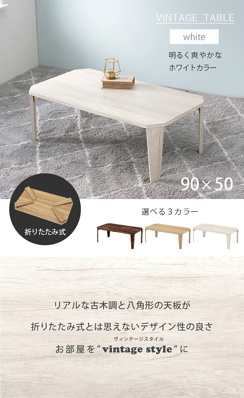 萩原(Hagihara) ローテーブル センターテーブル 机 【木目調天板がスタイリッシュ】 折りたたみ 完成品 軽量 ヴィンテージ リビング ソファテーブル 幅90×奥行50×高さ32 ホワイト MT-6861WS