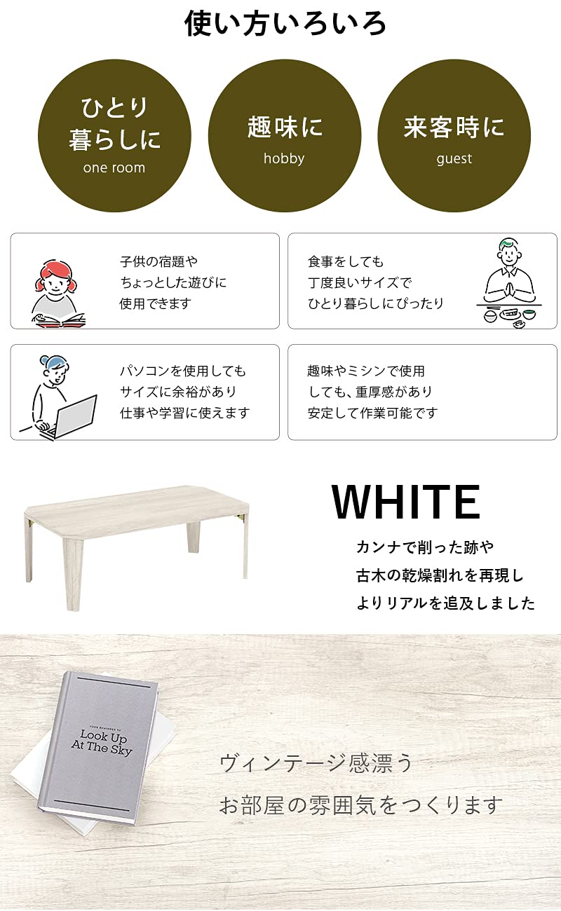 【新装セール】萩原(Hagihara) ローテーブル センターテーブル 机 【木目調天板がスタイリッシュ】 折りたたみ 完成品 軽量 ヴィンテージ リビング ソファテーブル 幅90×奥行50×高さ32 ホワイト MT-6861WS | ももくま屋さん