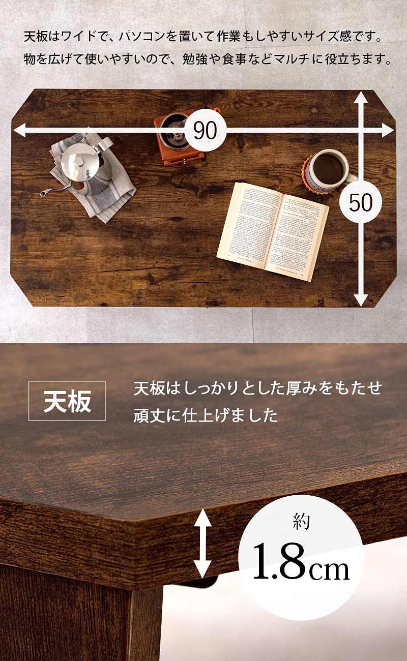 【幅90×奥行50のコンパクトサイズ】:省スぺースながらパソコンを置いての作業もしやすいサイズ感。勉強用・食卓・テレワークなど、マルチに役立ちます。