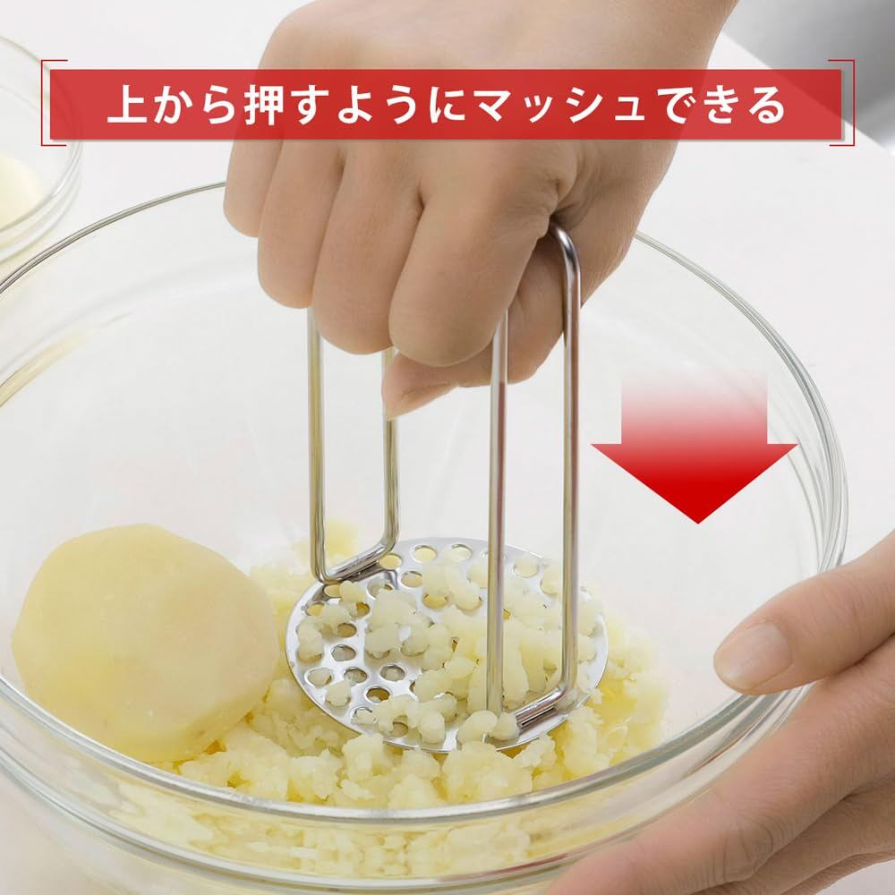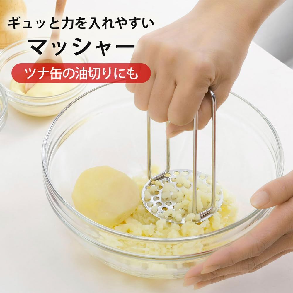下村企販 マッシャー 【日本製】 食洗機対応 力が入りやすいロングハンドル ツナ缶の油切り コーン缶の水切り じゃがいも ポテト 卵 アボカド ステンレス 燕三条 ママクック 35695