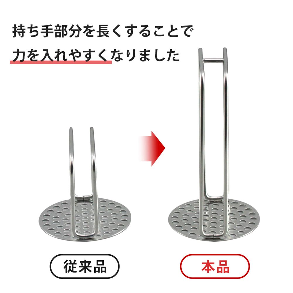 通常のマッシャーとしての使用はもちろん、ツナ缶の油切りや、とうもろこし缶の水切りにも使用できる便利商品になった