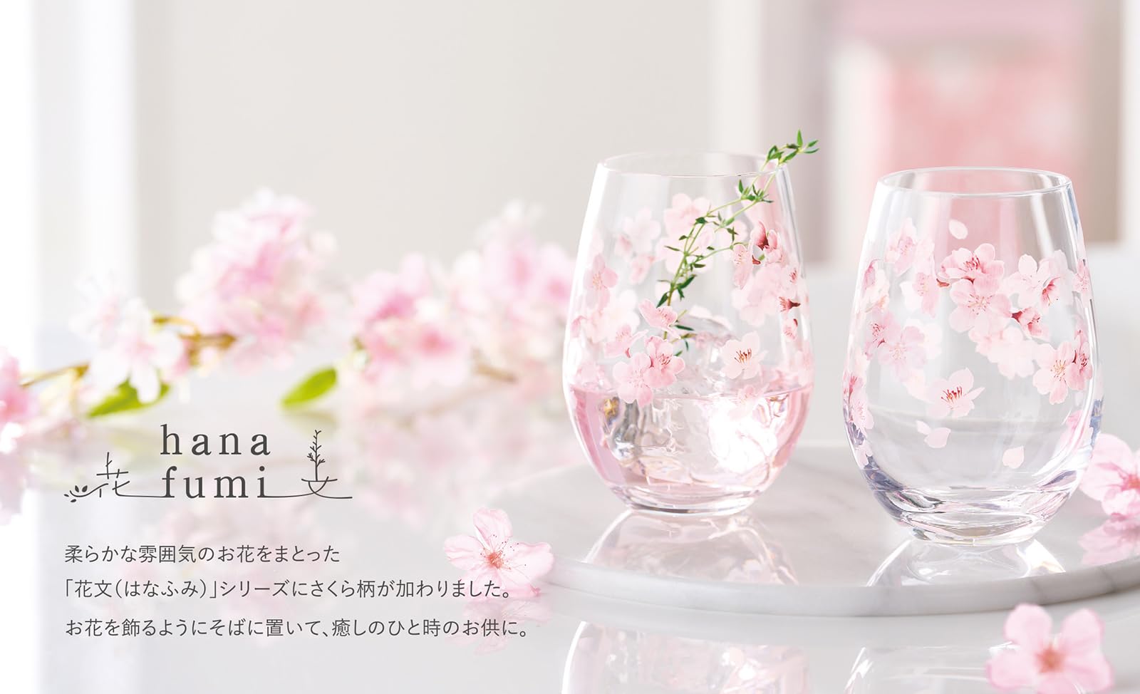 柔らかな雰囲気のお花をまとった「花文(はなふみ)」シリーズにさくら柄が加わりました。お花を飾るようにそばに置いて、癒しのひと時のお供に。春に華やかに咲き誇るさくらは「物事の始まり」連想させることから縁起の良いものだとされています。新生活のプレゼントにも最適です。専用化粧箱入りです。