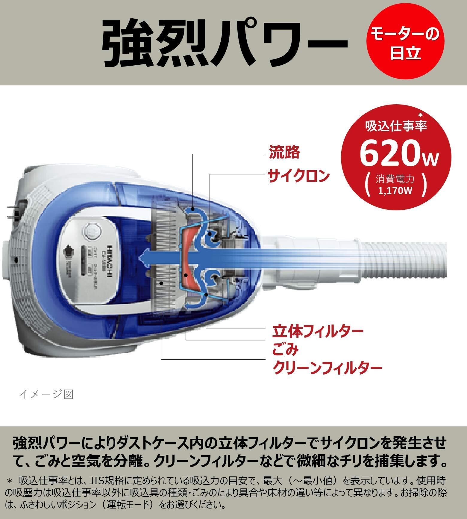●吸込仕事率620W(消費電力1,170W)強烈パワー 強烈パワーによりダストケース内の立体フィルターでサイクロンを発生させて、ごみと空気を分離します。さらに、クリーンフィルターなどで微細なチリを捕集します。