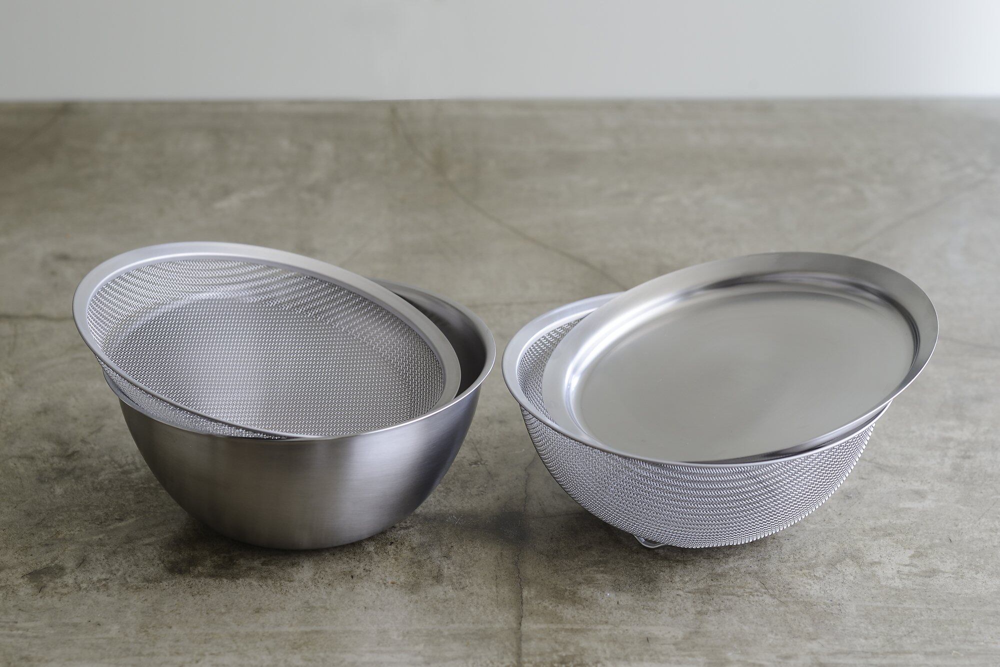 同サイズのボウルと合わせて使うことで、格段に料理しやすくなります。 四人家族のお味噌汁のお出汁なら中サイズが便利です。 漉した出汁がたっぷりボウルに受けられるよう浅型にしたので、鰹節や煮干しが出汁に浸かることがありません。 ・サイズは大(27cm)、中(21cm)、小(15cm)の3種類。 ・耐久性に優れた18-8ステンレス鋼を使用。 ・丈夫な綾織を採用して網を支えるワイヤーを無くしたので、汚れが溜まりにくく洗いやすいので清潔を保てます。 ・縁は一枚のステンレス板をくり抜いて作ったので、つなぎ目がなく洗いやすいです。