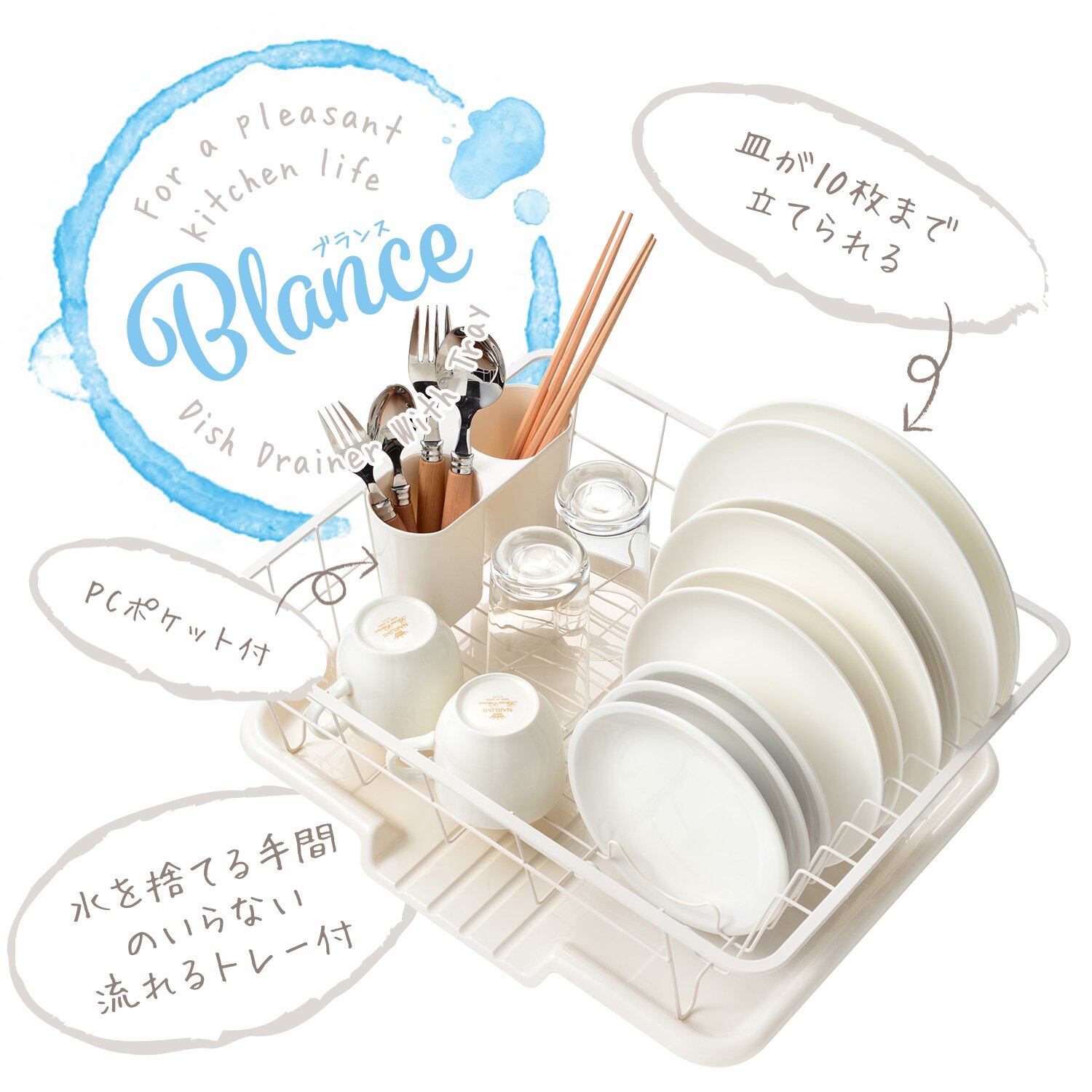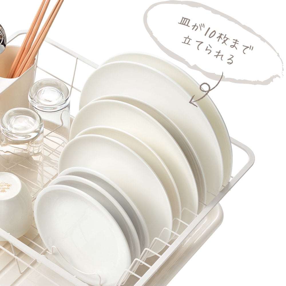 お皿を10枚まで立てられます。カトラリー等の水切りに便利なポケット付。