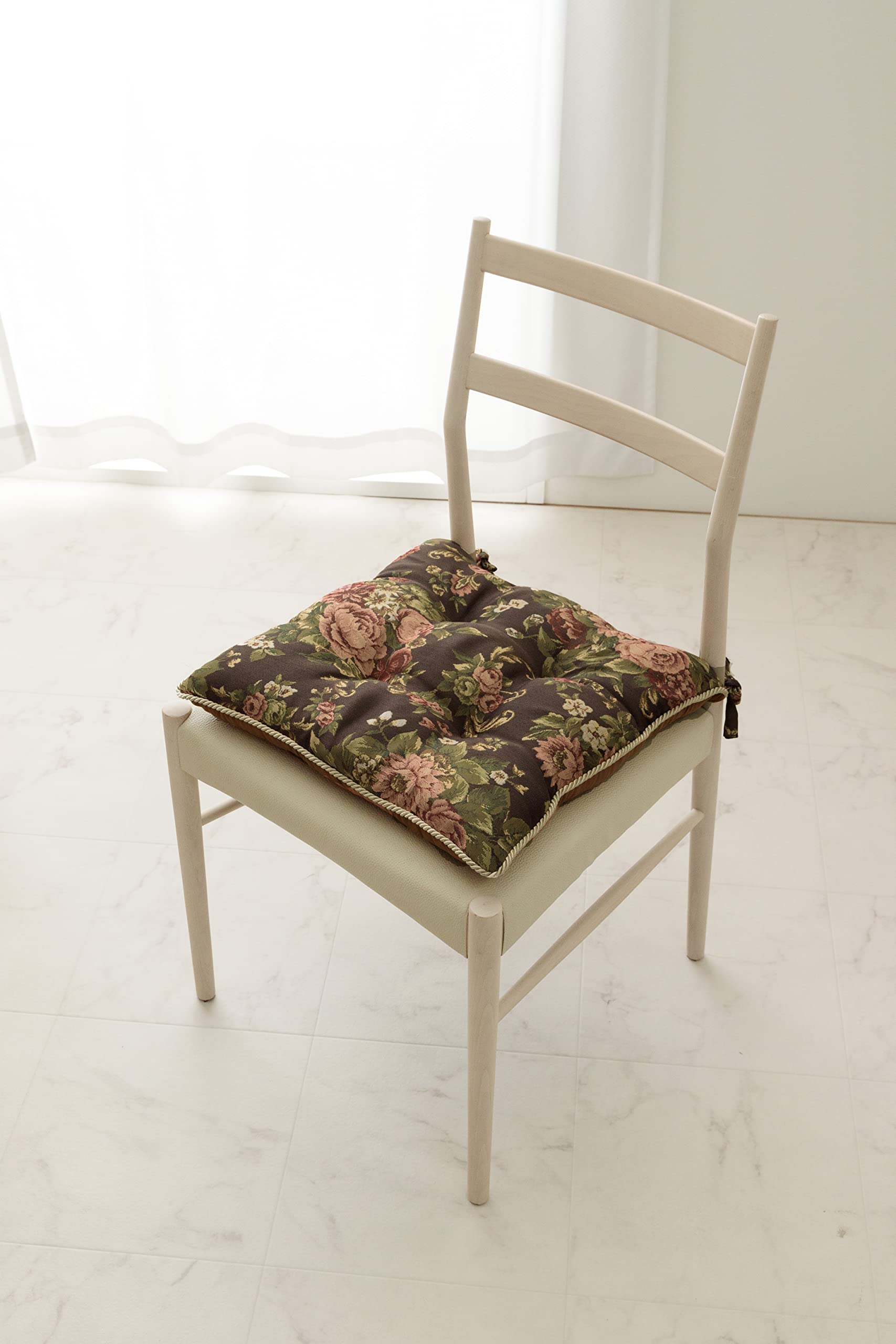 エレガントな柄をジャガード織りで織り上げた高級感のあるシートクッションです。 便利なひも付きタイプ。 ダイニングチェア、車のシートなど様々なシーンでご使用いただけます。 国内綿入れ加工で安心安全。ふかふか感をお楽しみください。