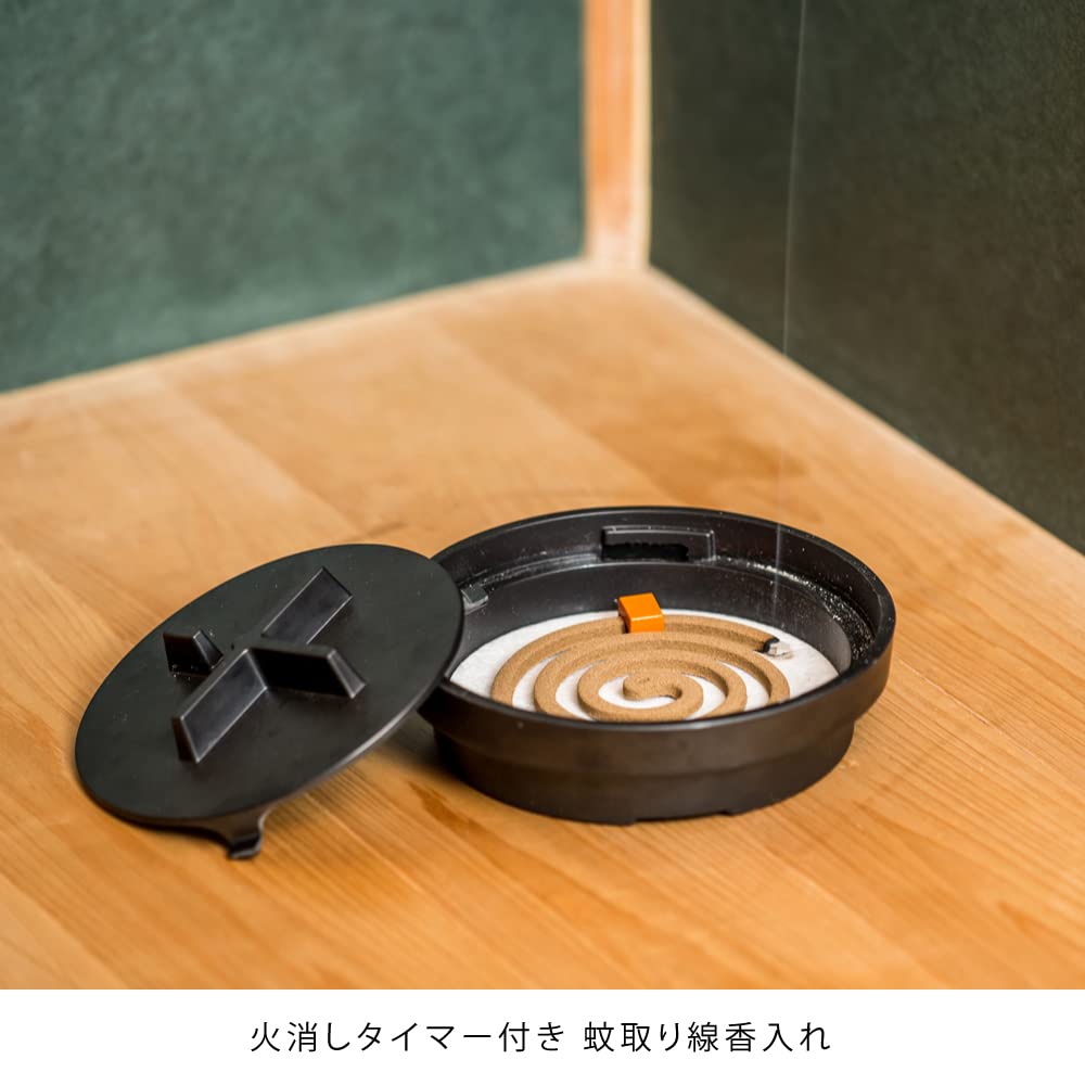 デザイン性と機能性を兼ね揃えた蚊取り線香入れです。 火消しタイマーは蚊取り線香に被せるように置くだけで、 火の付いた線香に触れることなくタイマー部分で火が消える仕組み。