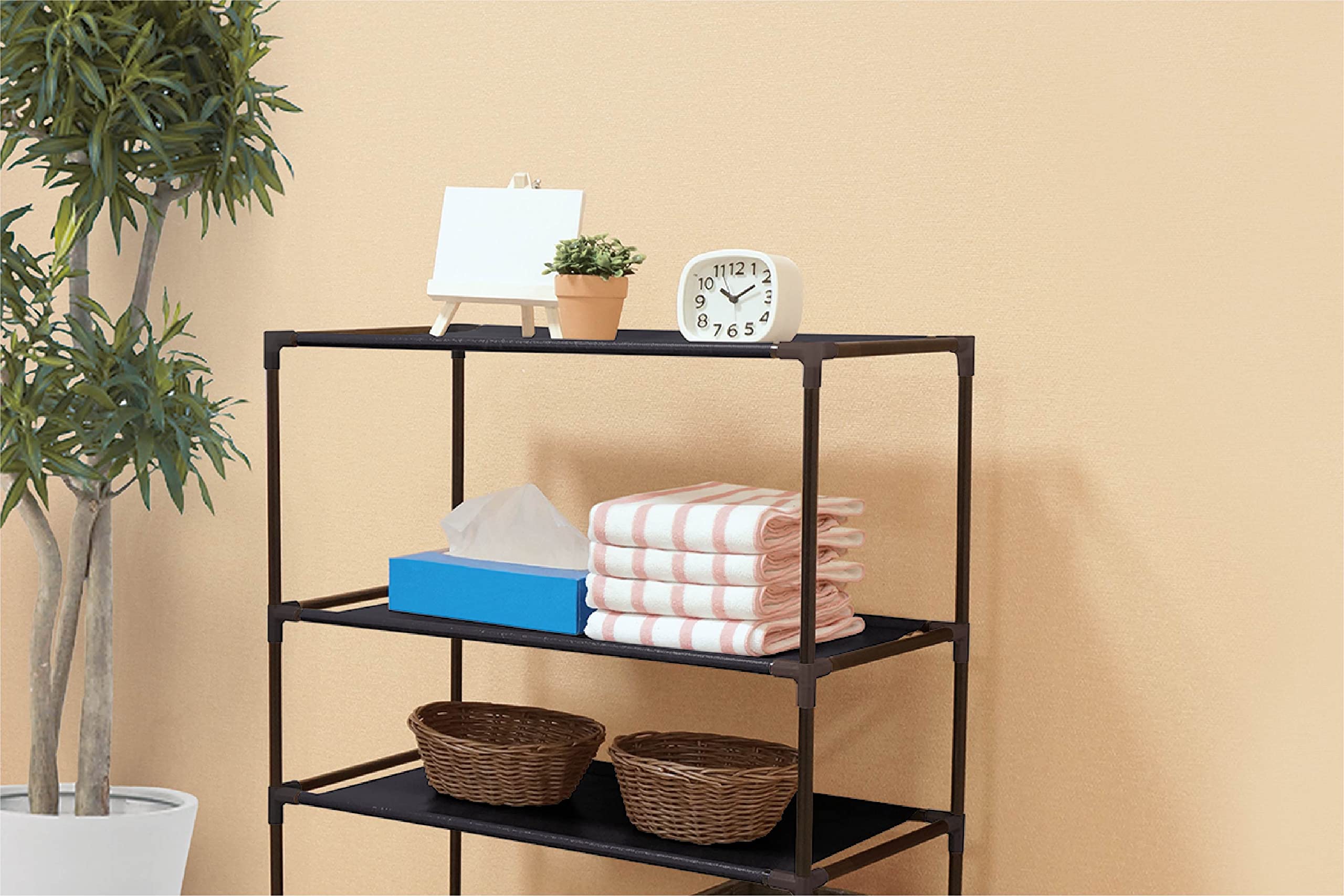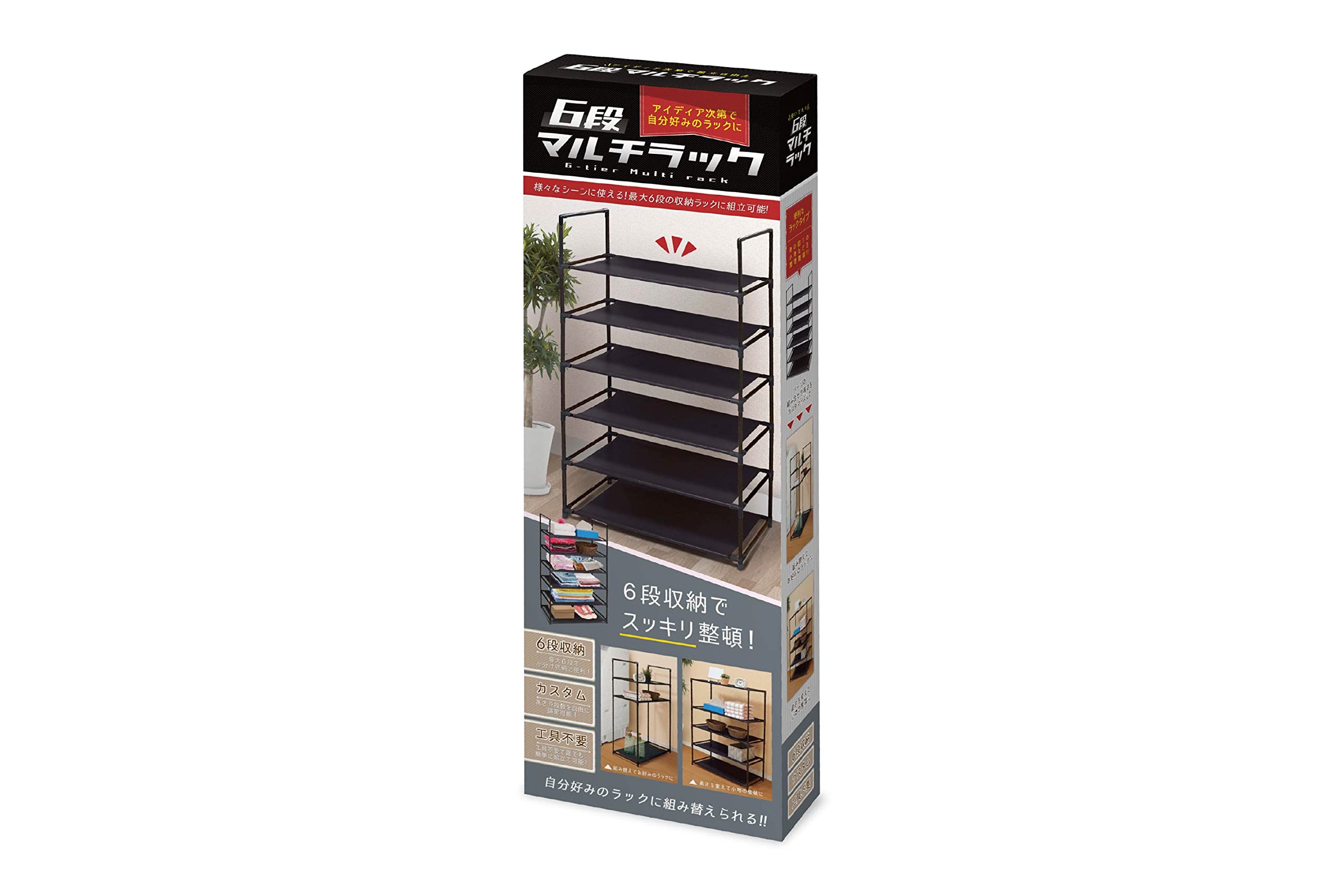 設置場所や用途に合わせて、段数や高さを自由にカスタムできるマルチラック。ジョイントパーツとパイプを組み合わせるだけなので、お一人でも工具不要で簡単に組み立て可能です。衣服を置いたり、タオルを置いたり、小物を置いたり。様々な用途に使えて便利なマルチラックです。