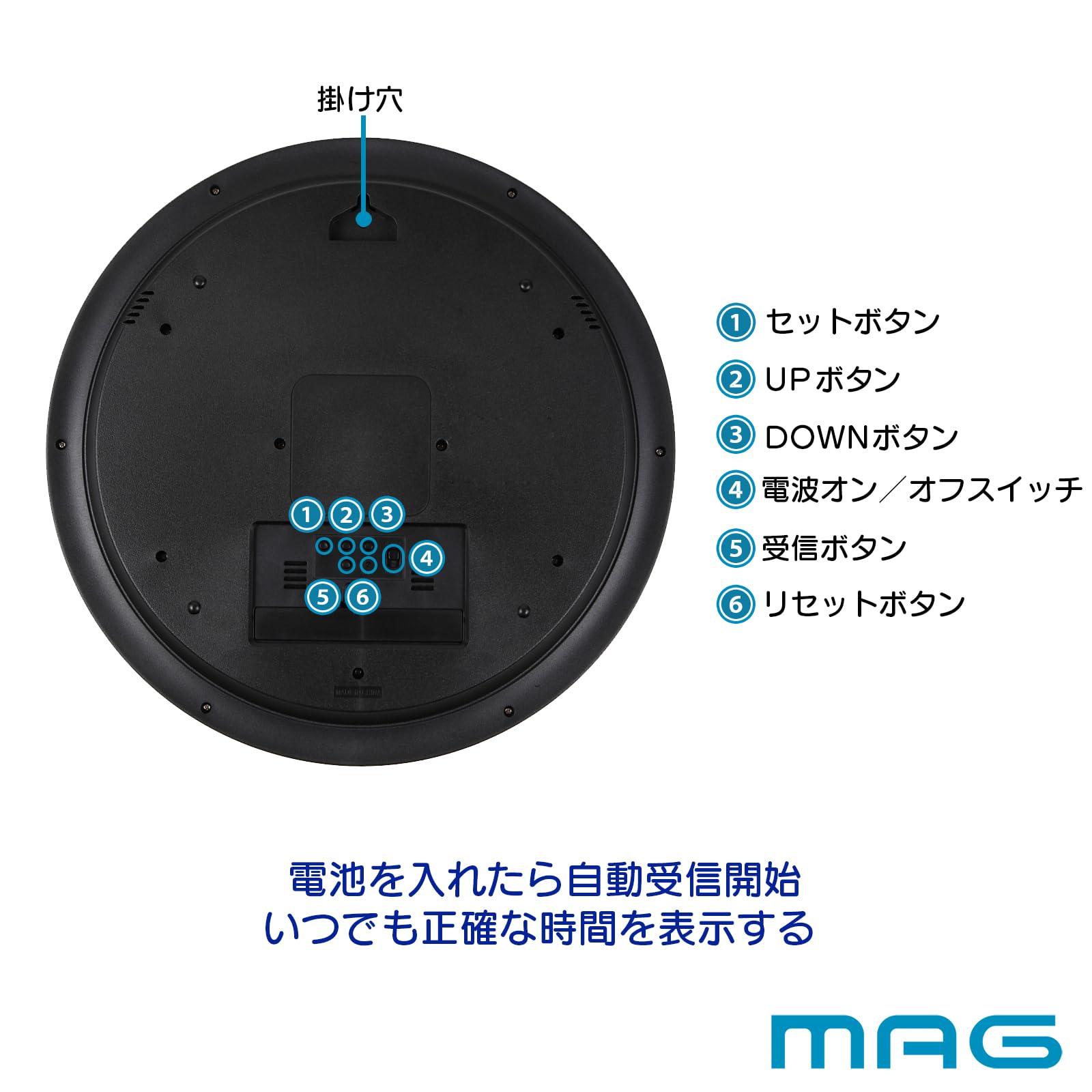 機能:電波受信機能(自動受信、手動受信)、電波受信状況表示、ステップ秒針、夜間秒針停止機能 (午後10時~午前6時)、カレンダー表示、六曜表示、温度表示、湿度表示、環境目安表示
