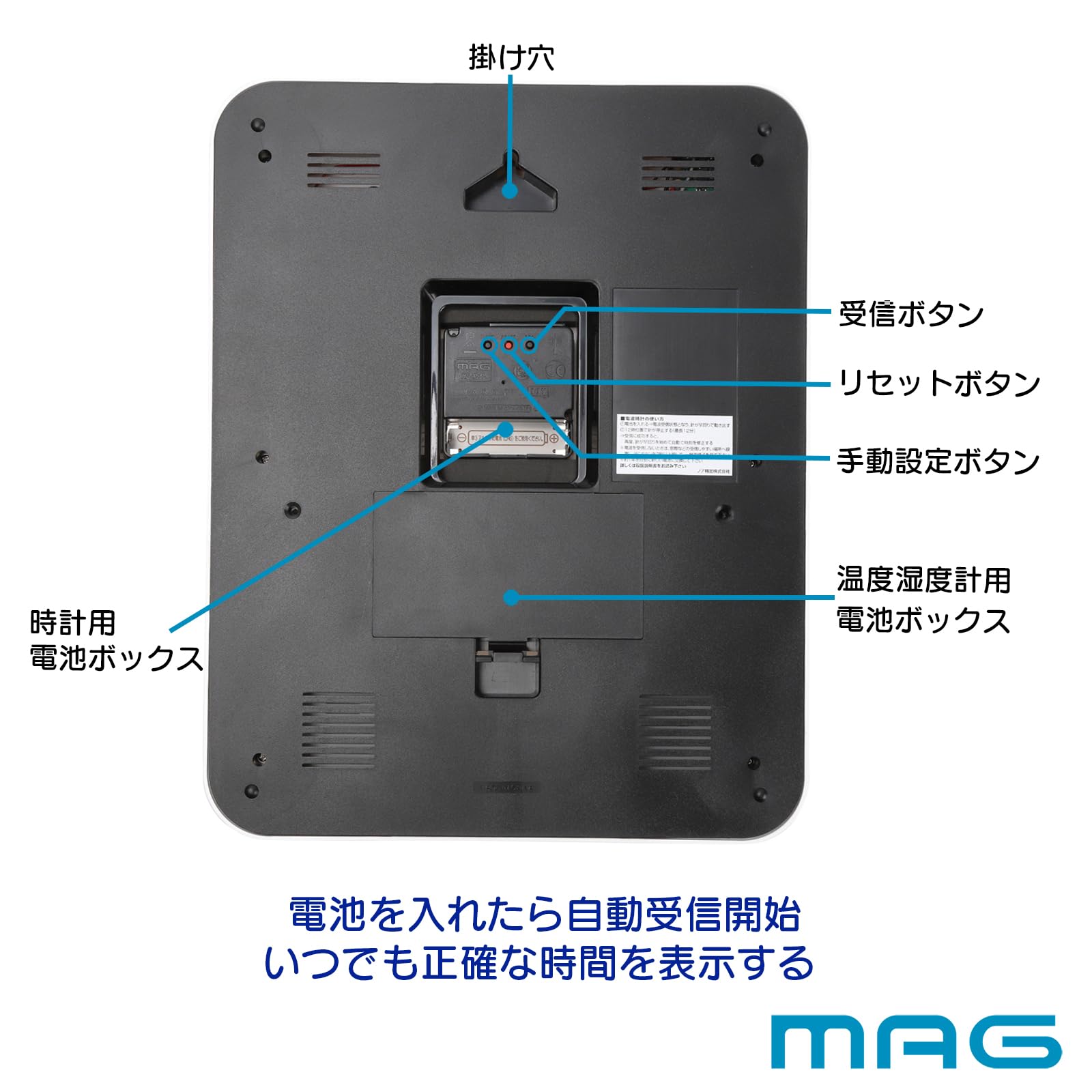 機能・仕様:電波受信機能 (自動受信/手動受信)、秒針停止機能 (午後10時~午前6時)、ステップ秒針、温度表示、湿度表示、自動点灯機能 (光センサー)、置き掛け兼用