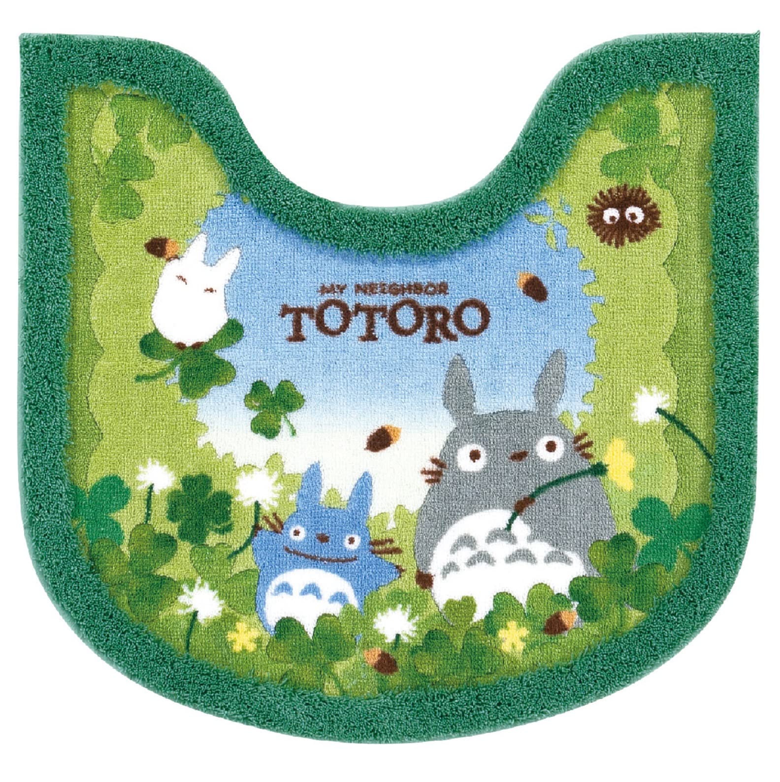 生い茂るクローバーの中で遊ぶトトロ達をプリントデザイン。奥に見える青空や水彩画タッチのクローバーのグラデーションと奥行き感を感じられるトイレタリー。裏面すべりにくい加工。