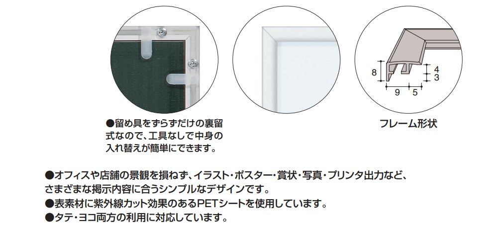 ●留め具をずらすだけの裏留式なので、工具なしで中身の入れ替えが簡単にできます。入れ替え頻度が高い掲示に適しています。
