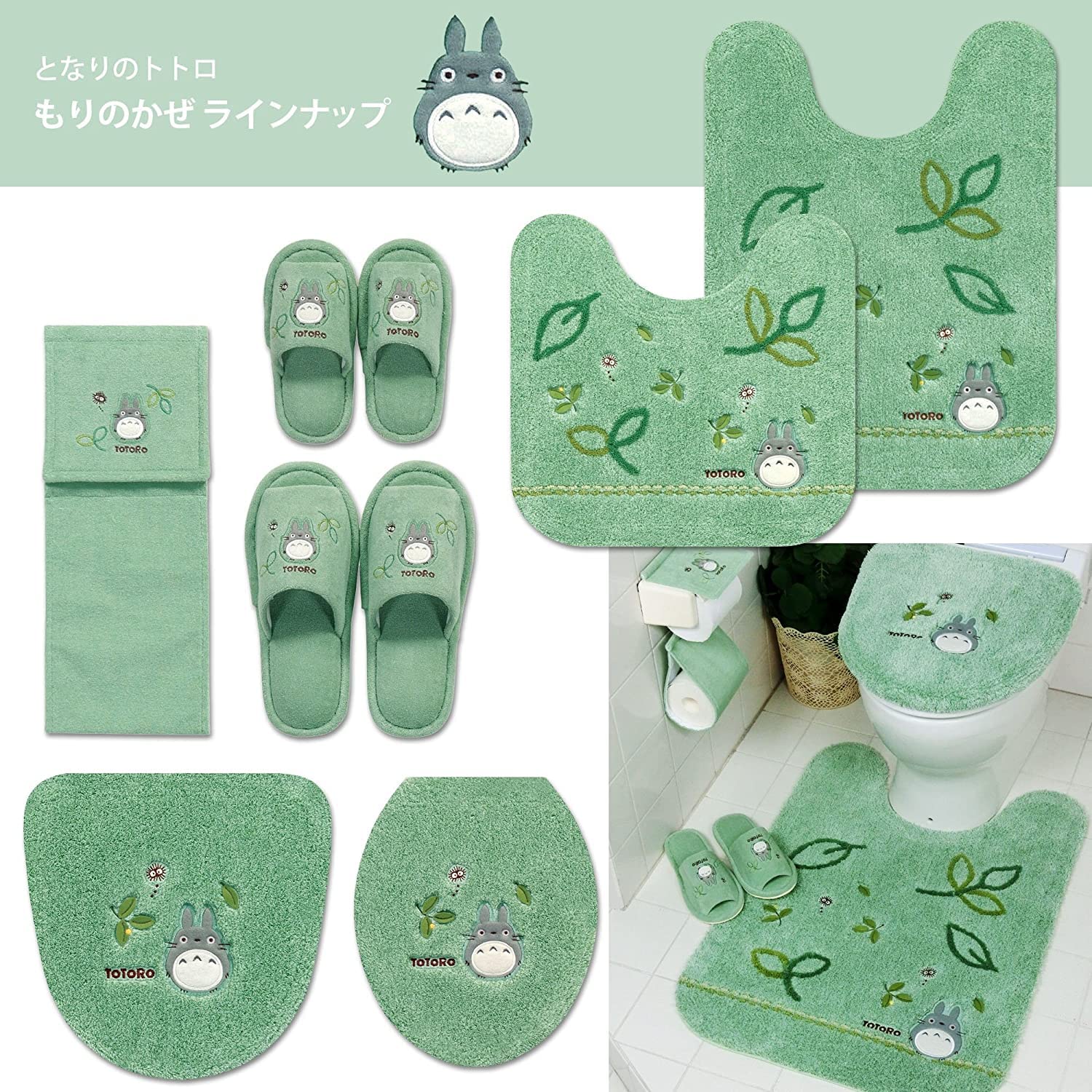 森を吹き抜ける風に、葉っぱが舞い上がる・・映画のワンシーンを思わせる情景をトトロが見つめています。森をイメージして明るさを抑えたグリーン色が落ち着いたトイレ空間を演出します。