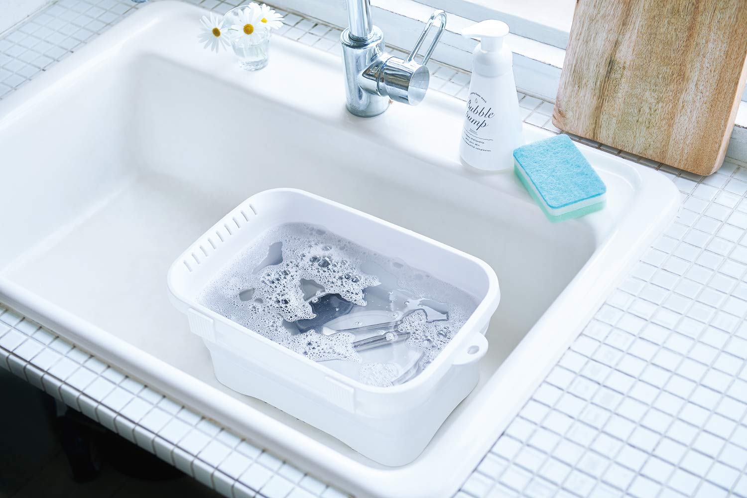 ●キッチン用、折りたたみ洗い桶 ●場所を取らないタテ置きで使用後は折りたたんでコンパクトに収納