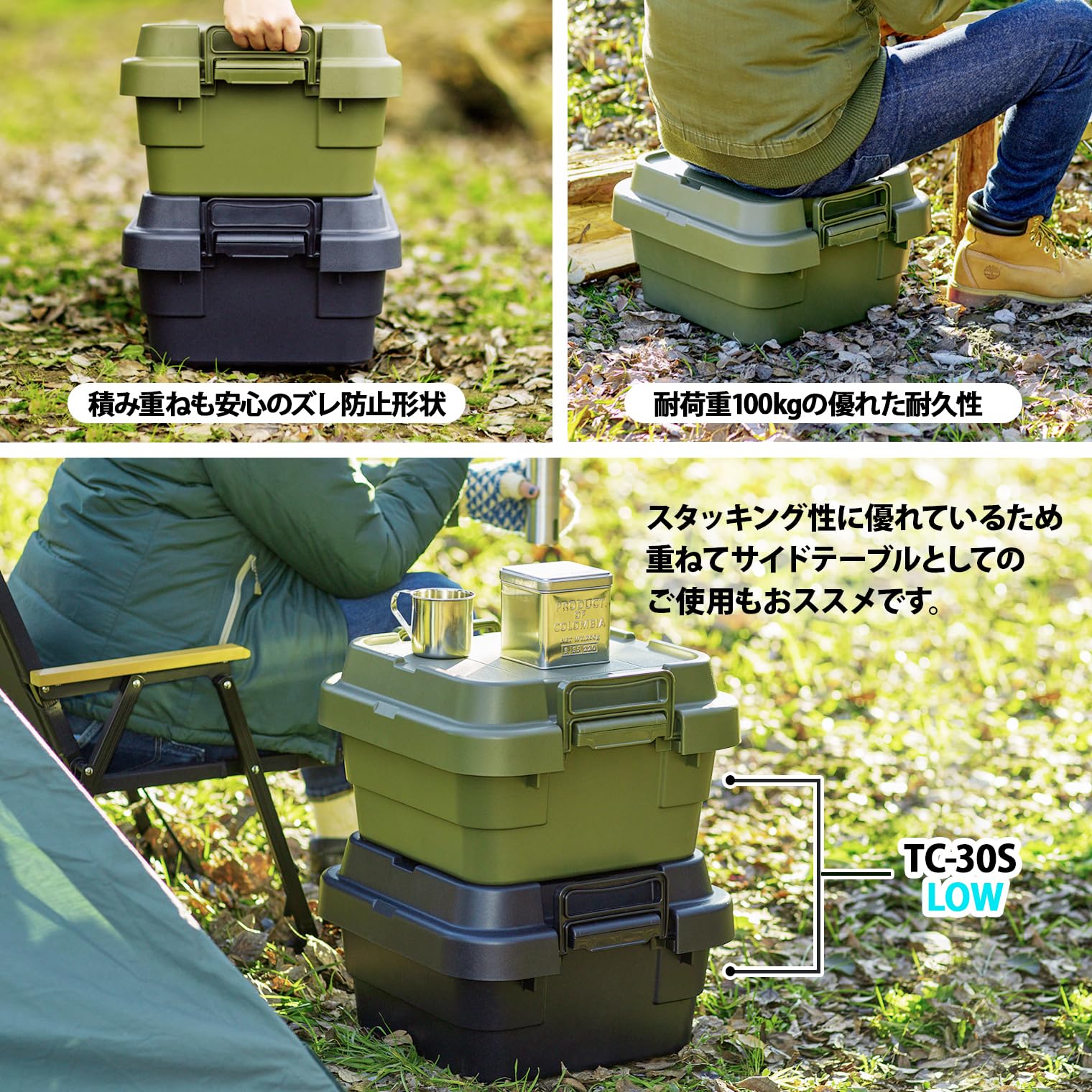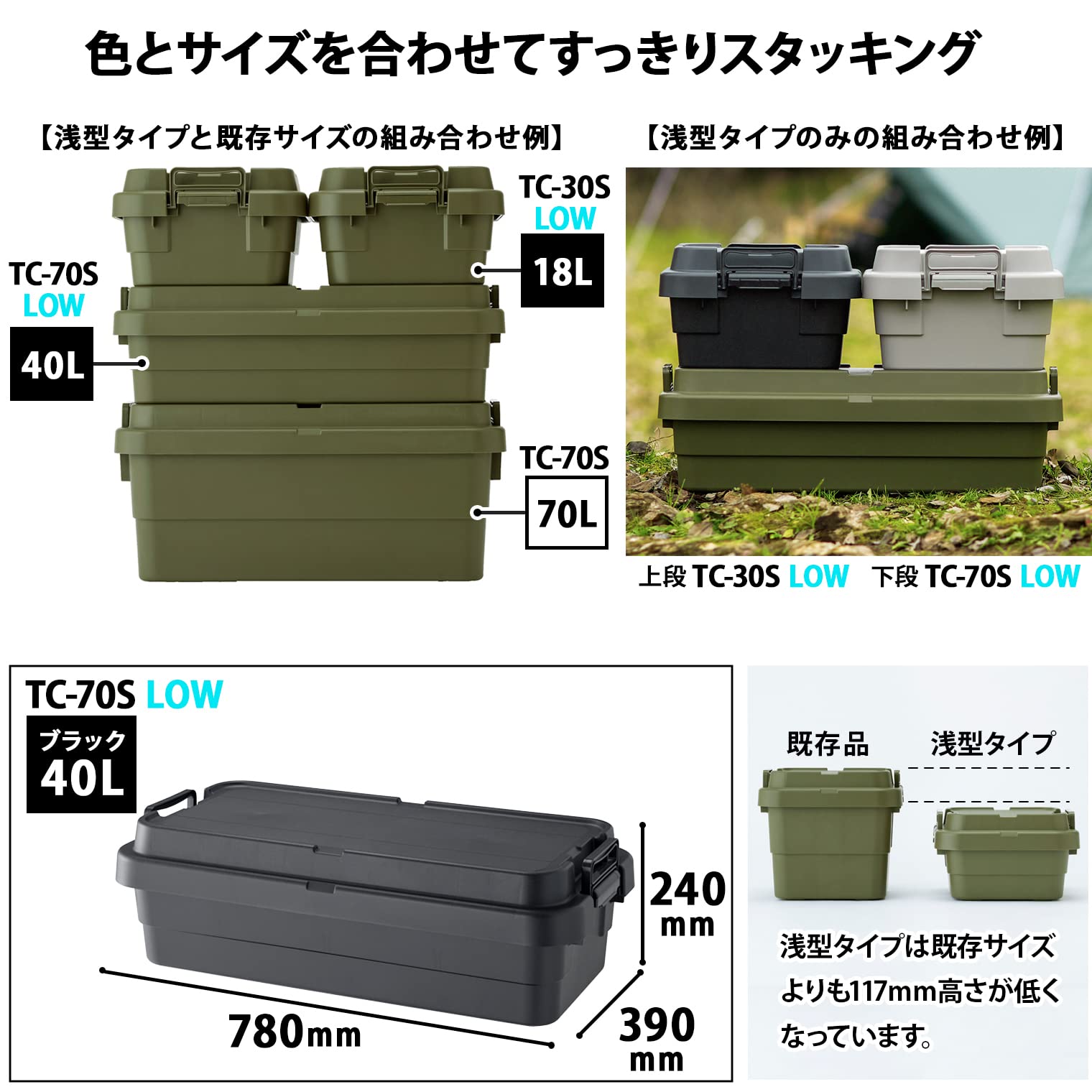 高さ以外のサイズはTC-70Sと同じ、そしてLOWタイプ3段はTC-70S×2段の高さと同じ、と統一した規格で設計されているので車に積む時や収納する時などに効率よくすっきりおさめられます。