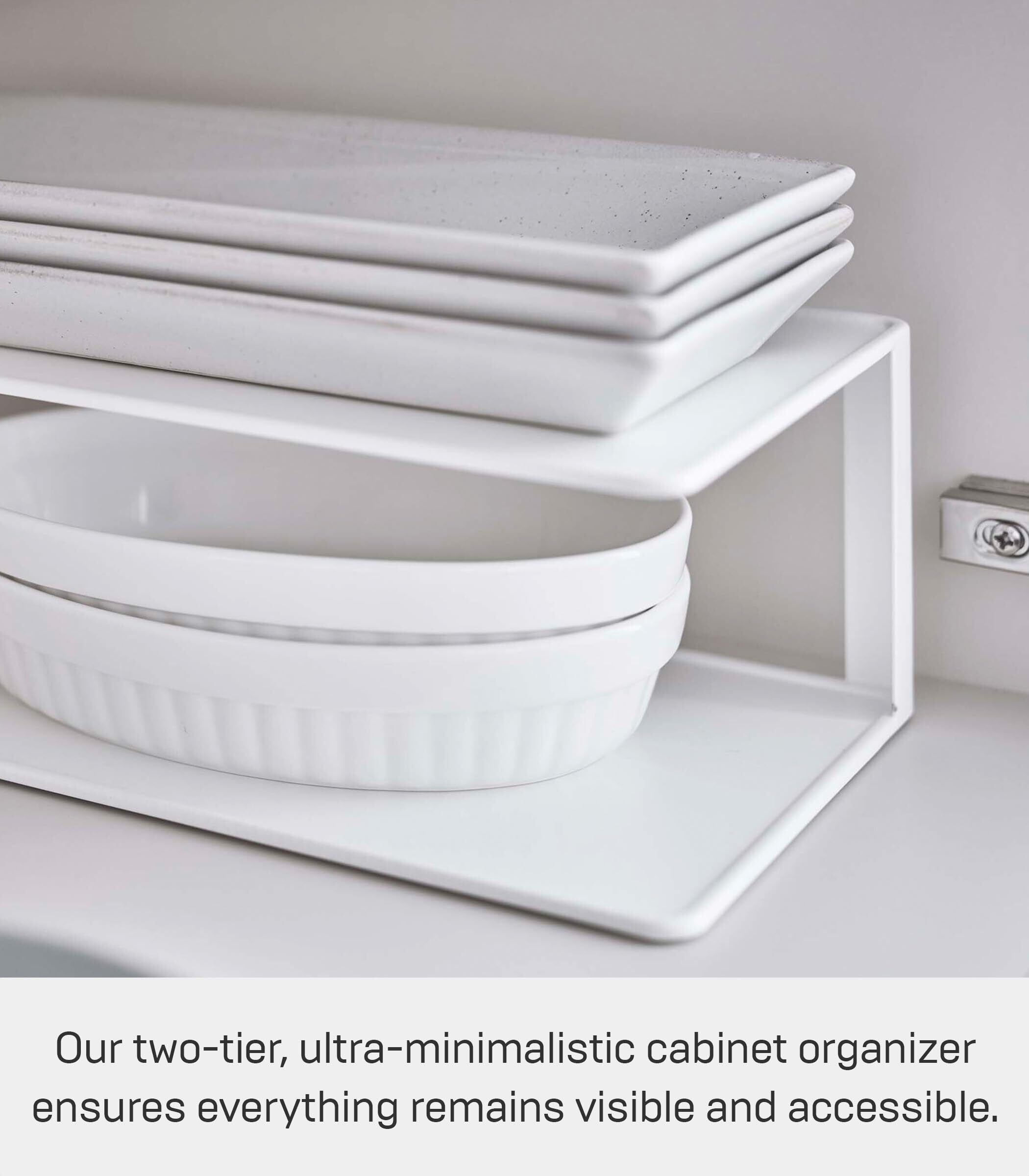 魚用の長い和皿やカレー・グラタン皿など収納場所に困る長皿を上下2段で一括収納。2本の支柱なので横や前からサッとお皿がとれる構造。シンプルで強度も強いスチール製です。