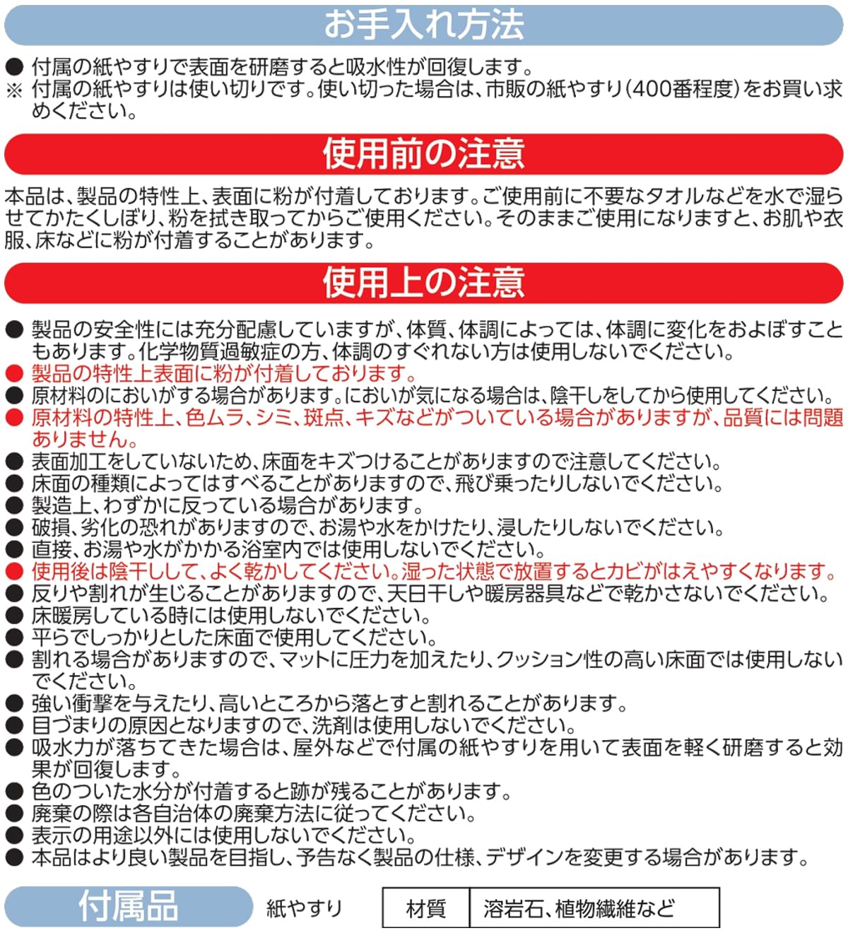 ●付属の紙やすりで表面を研磨すると吸水性が回復します。
