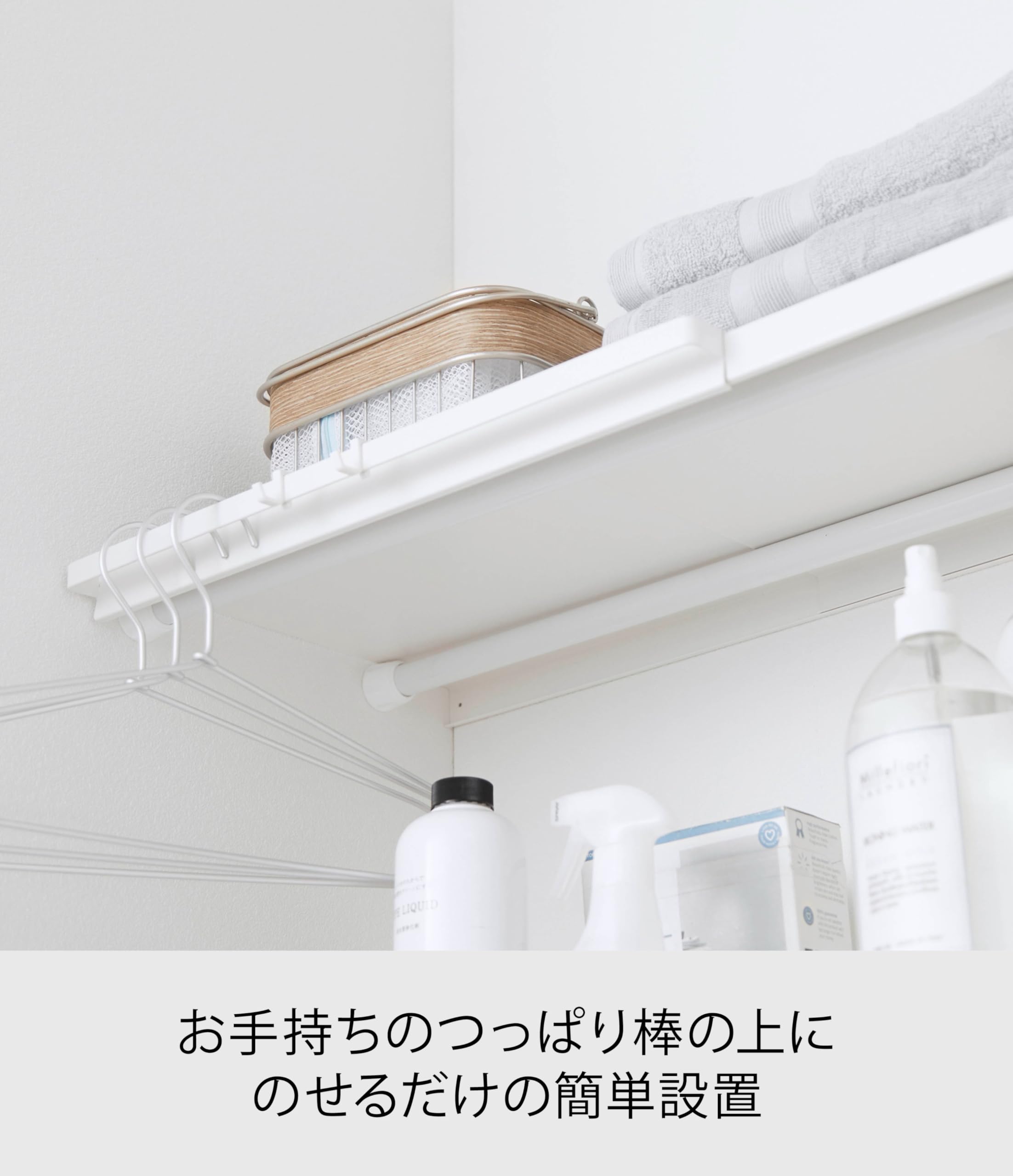 つっぱり棒に乗せるだけで棚が完成! 伸縮式なので使いたい幅に合わせて設置できます。