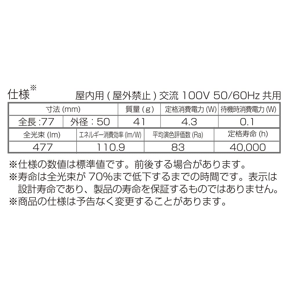【 特 長 】 ● 人が近づくと自動点灯、人感・明暗センサー付きLED電球 ● 周囲が暗いとき人が近づくと点灯します ● 人検知で自動点灯延長 ● 小形電球40W形相当の明るさ ● 配光角約90° ● 昼光色相当 ● 口金:E17 【 仕 様 】 ■ 寸法:全長…77mm、最大径…50mm ■ 質量:41g ■ 定格消費電力:4.3W ■ 待機時消費電力:0.1W ■ 全光束:477lm ■ エネルギー消費効率:110.9lm/W ■ 平均演色評価数:Ra83 ■ 定格寿命:40000h ※屋内用(屋外使用禁止) ※交流電流 100V 50/60Hz 共用