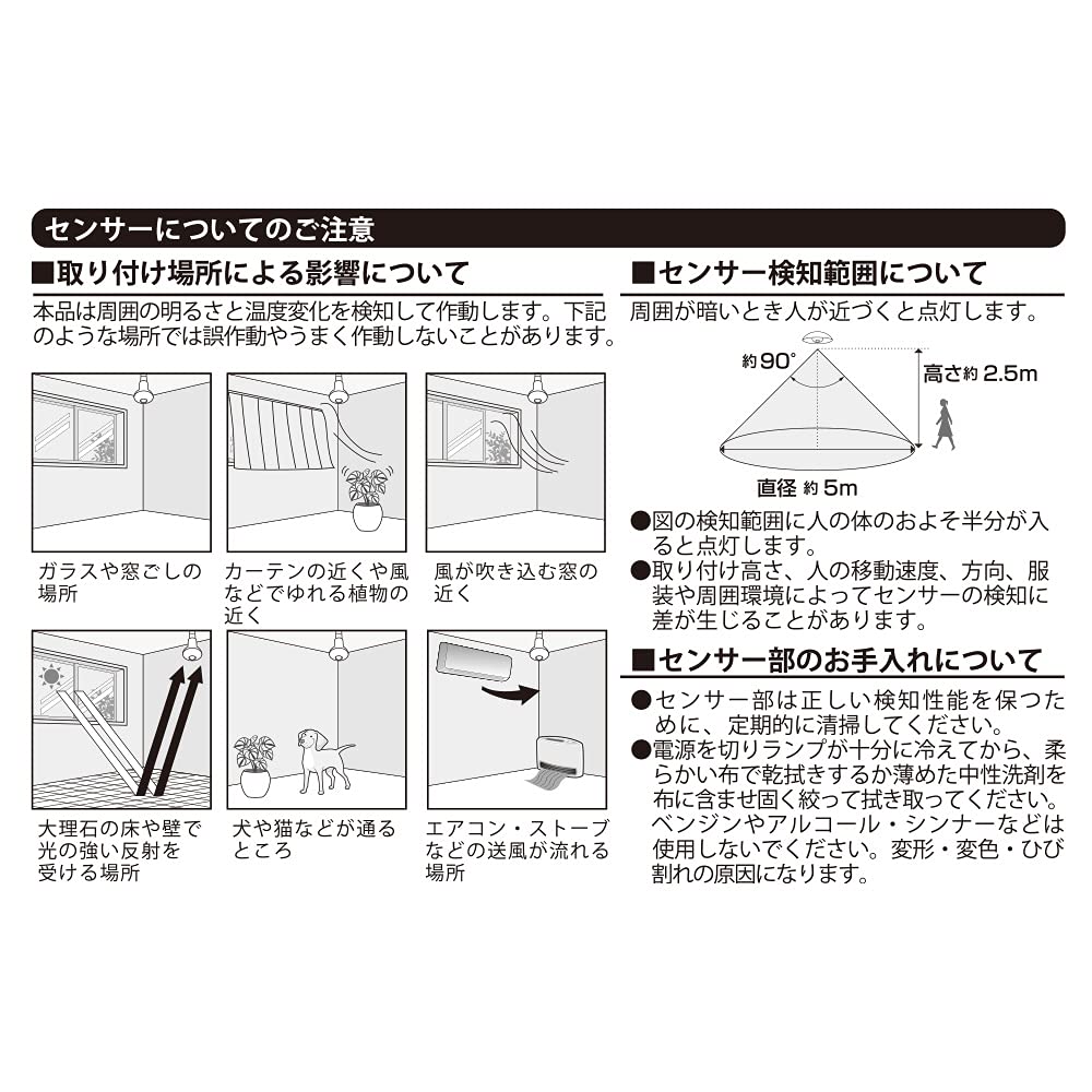 ※次の器具では使用できません(センサー検知障害の原因) ・下面解放型器具でも、細長い器具や、ランプの取り付け位置が奥まっている器具では、センサーが検知しなかったり、 検知範囲が狭くなる場合がありますので使用できません ・白熱電球専用の人感センサー付器具・リモコン付器具など ・取り付け高さが3m以上になる器具 ・ランプを2個以上装着する器具(この他の状況により使用できない場合があります) ・電子スイッチでは使用できません(誤作動の原因)