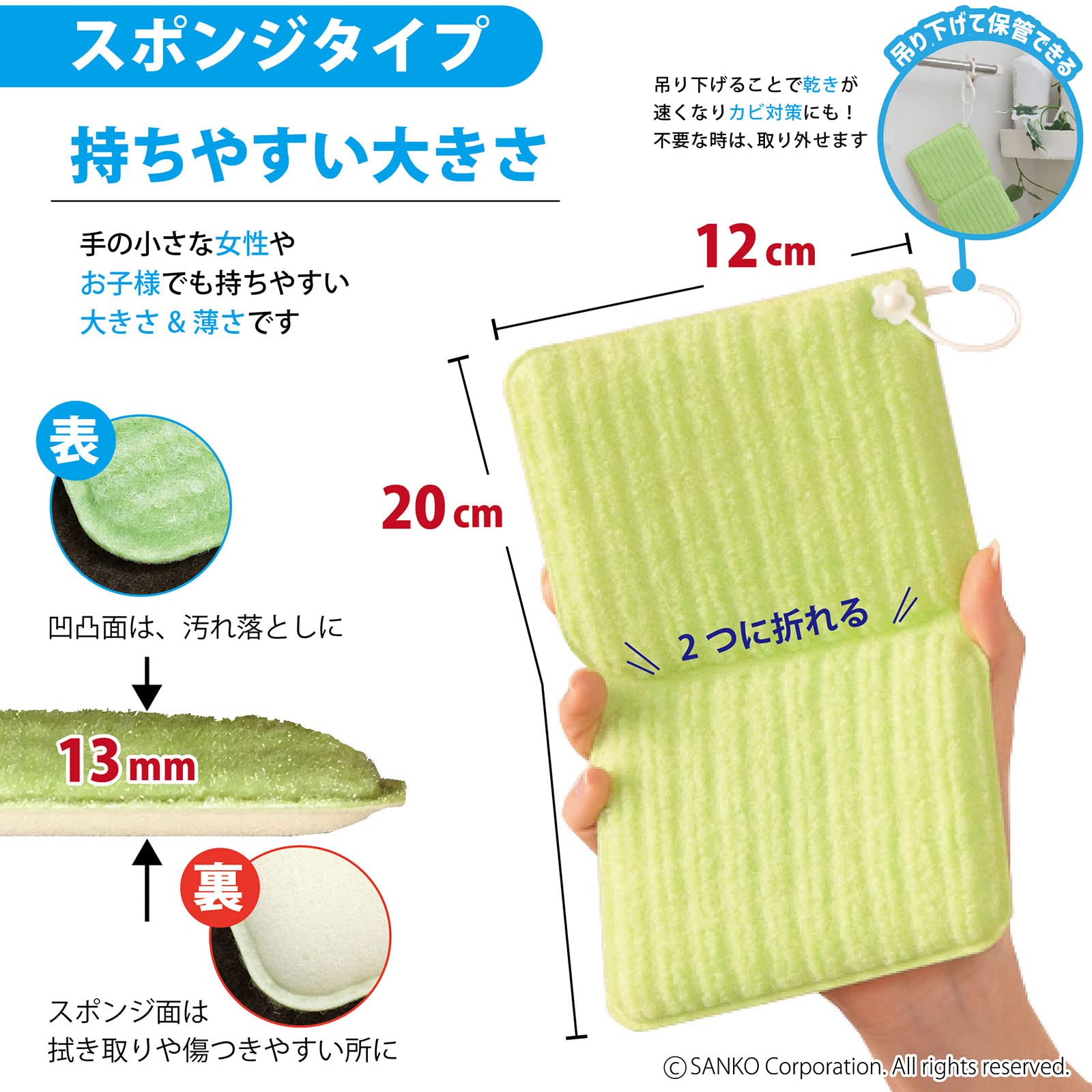 【形が変わる】中央に折り目が付いているので、ホースや桶などの挟み洗い、伸ばしたまま、折り曲げて厚みのあるスポンジにするなど、いろんな使い方ができます。