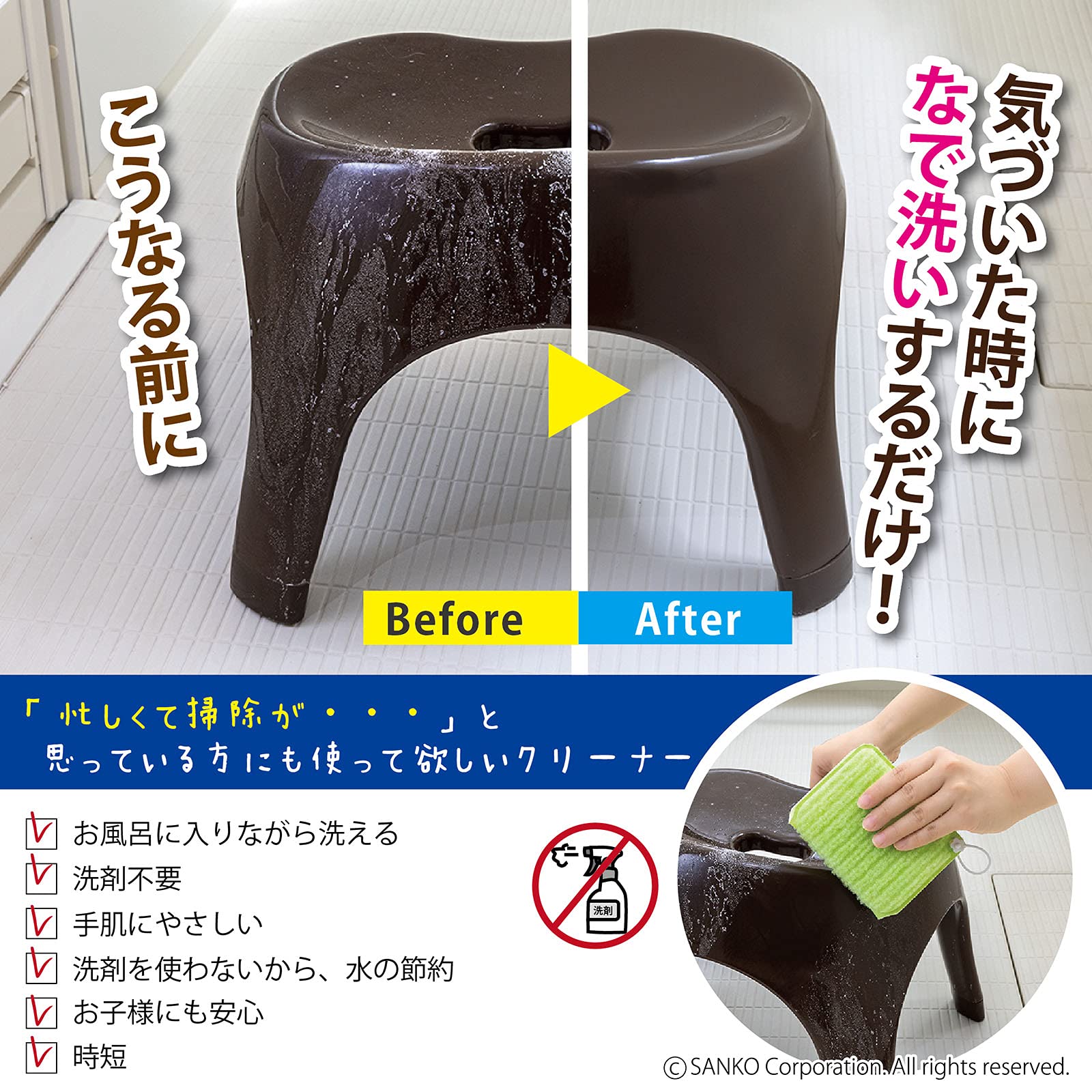 ●水だけで湯アカや汚れがスッキリ落とせる!。●3つに折れてバスタブのフチも洗いやすい。●。