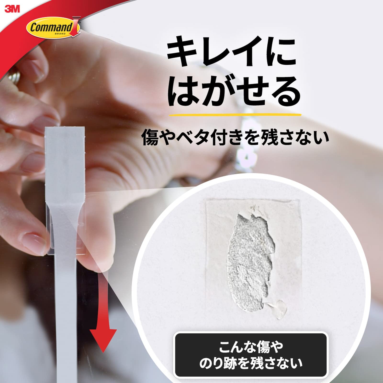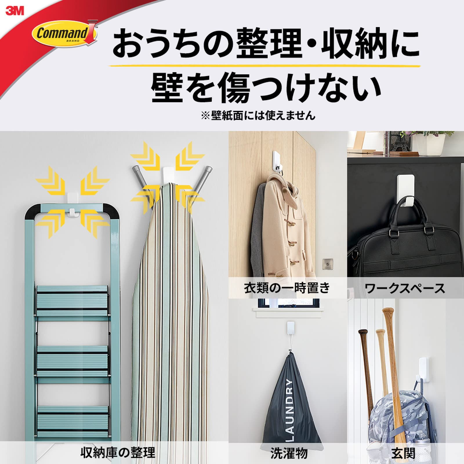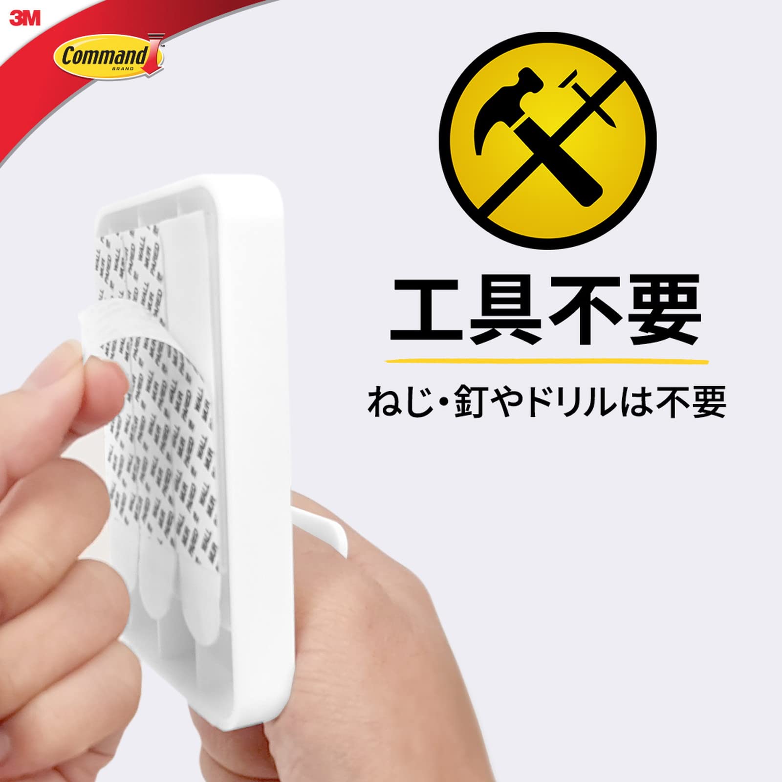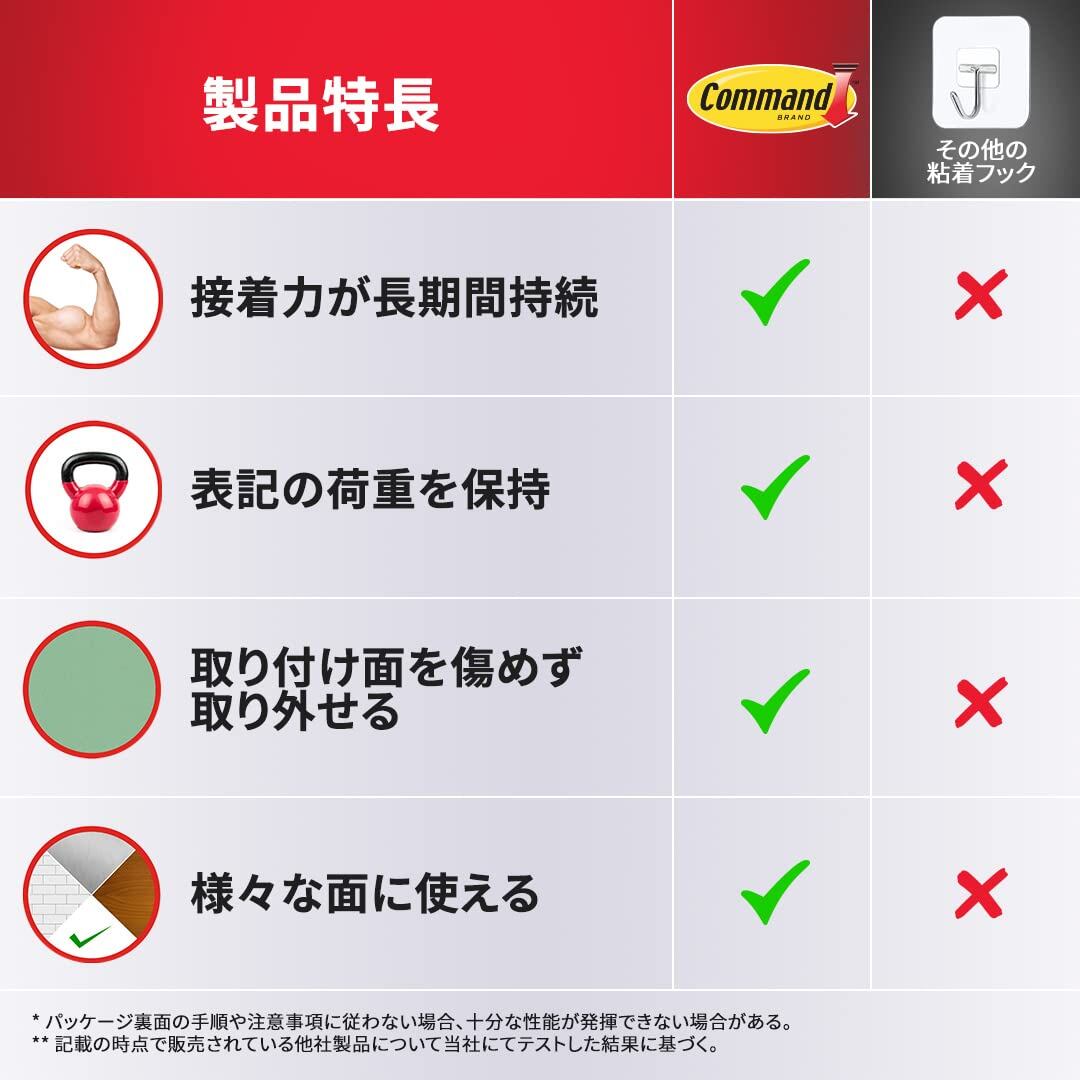 コマンドフック史上最大の耐荷重。シンプルでスタイリッシュなデザイン。幅広で奥行きのあるフック形状。取り付け面を傷めることなく設置でき、不要になったり移動する時はきれいに取り外せる。タブをゆっくり引き伸ばせば、のりを残さずきれいに、はがせる。はがしたフックは、粘着テープ(タブ)を取り替えて再利用できる。強力なフックなので、バッグやランドセル、リュック、カバン、厚いコート、荷物の一時置きや備品などの収納に便利。(耐荷重4.5kgまで)壁紙には使用できませんのでご注意ください。また、壁の素材によっては十分な耐荷重が得られない可能性があります。また、化粧シート構造の壁や表面の状態によっては、傷める場合がありますのでご注意ください。