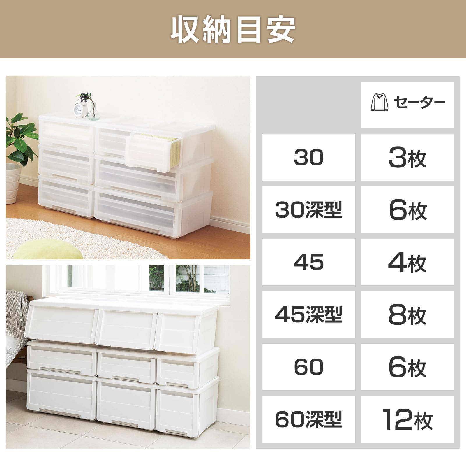冬物などの厚手の衣類やタオルケットなども収納できる、深型引き出し。衣類を立てて収納すれば中身も見やすい。