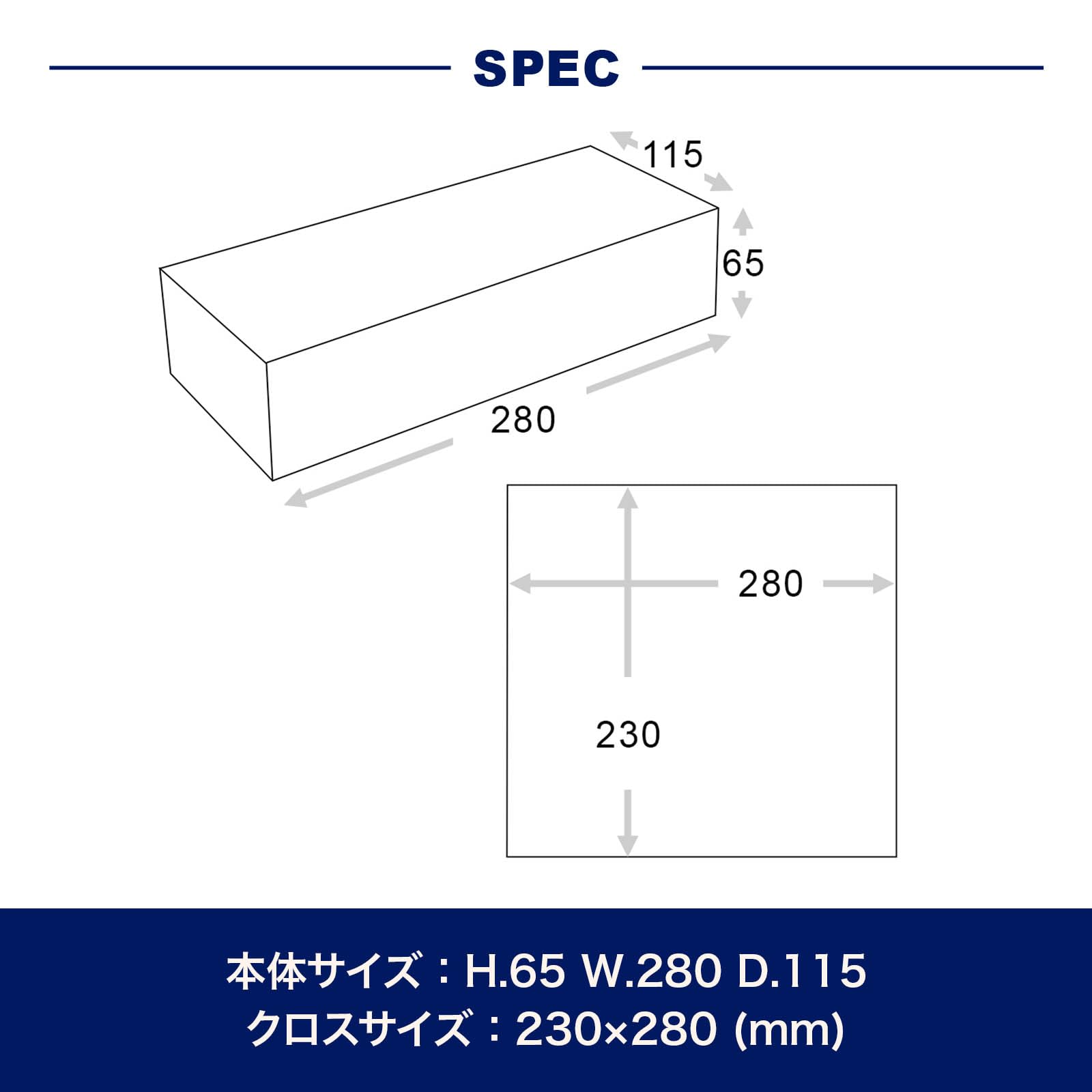サイズ :H.65mm W.280mm D.115mm Cloth size 230×280mm