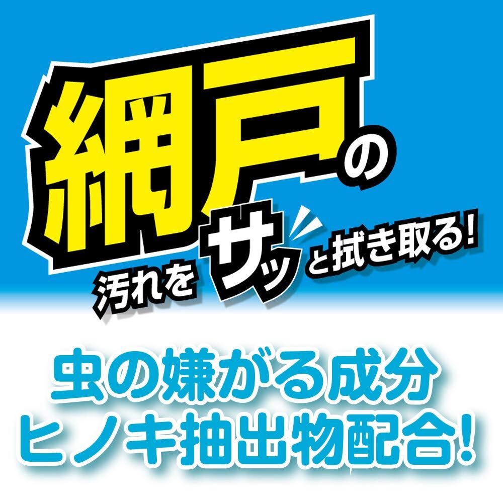 網戸の汚れをサッと拭き取れる、網戸用のお掃除シートです。手に優しい保護成分配合。虫の嫌がる成分ヒノキ抽出物配合。サイズ:約30×20cm