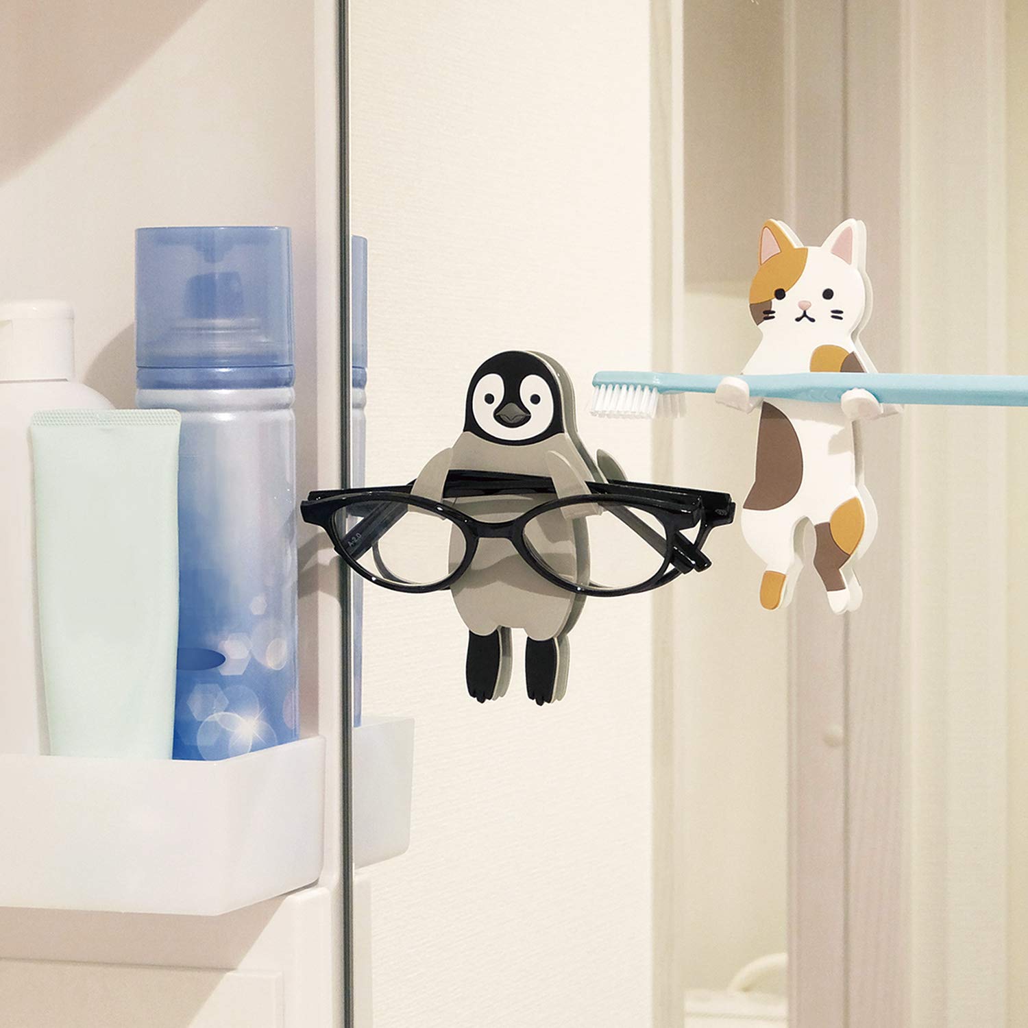 水回りの小物をギュッと抱えて ピタッと貼りつく吸着フック! 貼りはがしOK! 洗面所の鏡・お風呂場のタイル・ガラスなど、 ツルツルした場所に簡単に貼り付きます。 手足を曲げて歯ブラシ・コップ・ヘアゴム メガネなど、ごちゃつく小物をかわいく収納! コップかけや歯ブラシスタンドとしてご使用できます!