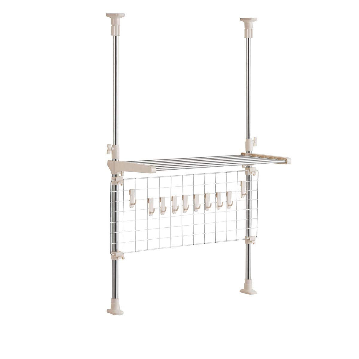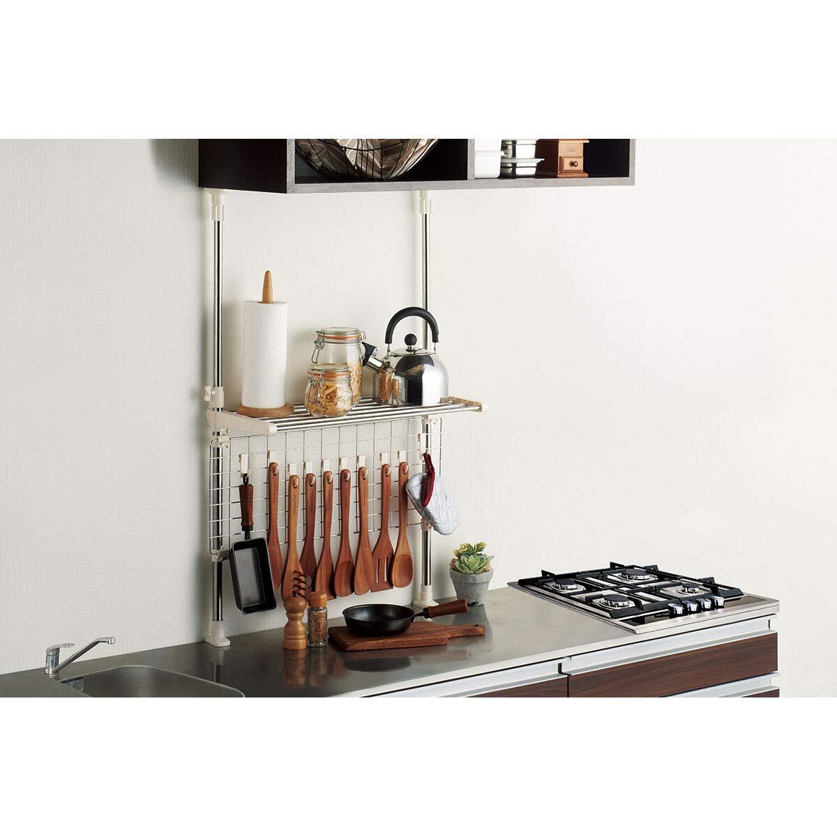 棚+ステンレスネットタイプ。吊り下げフック10個付なのでキッチンツールをすっきり収納。