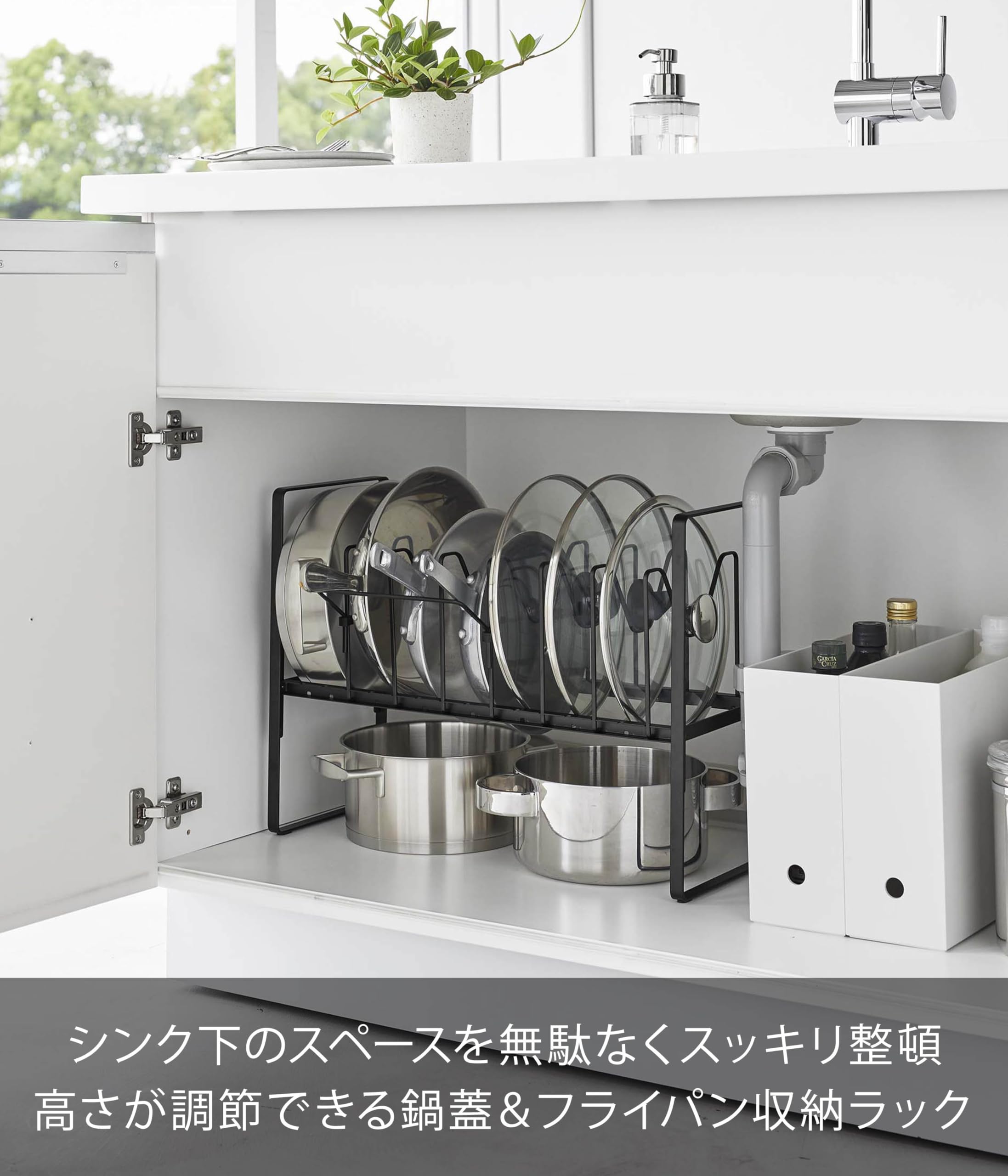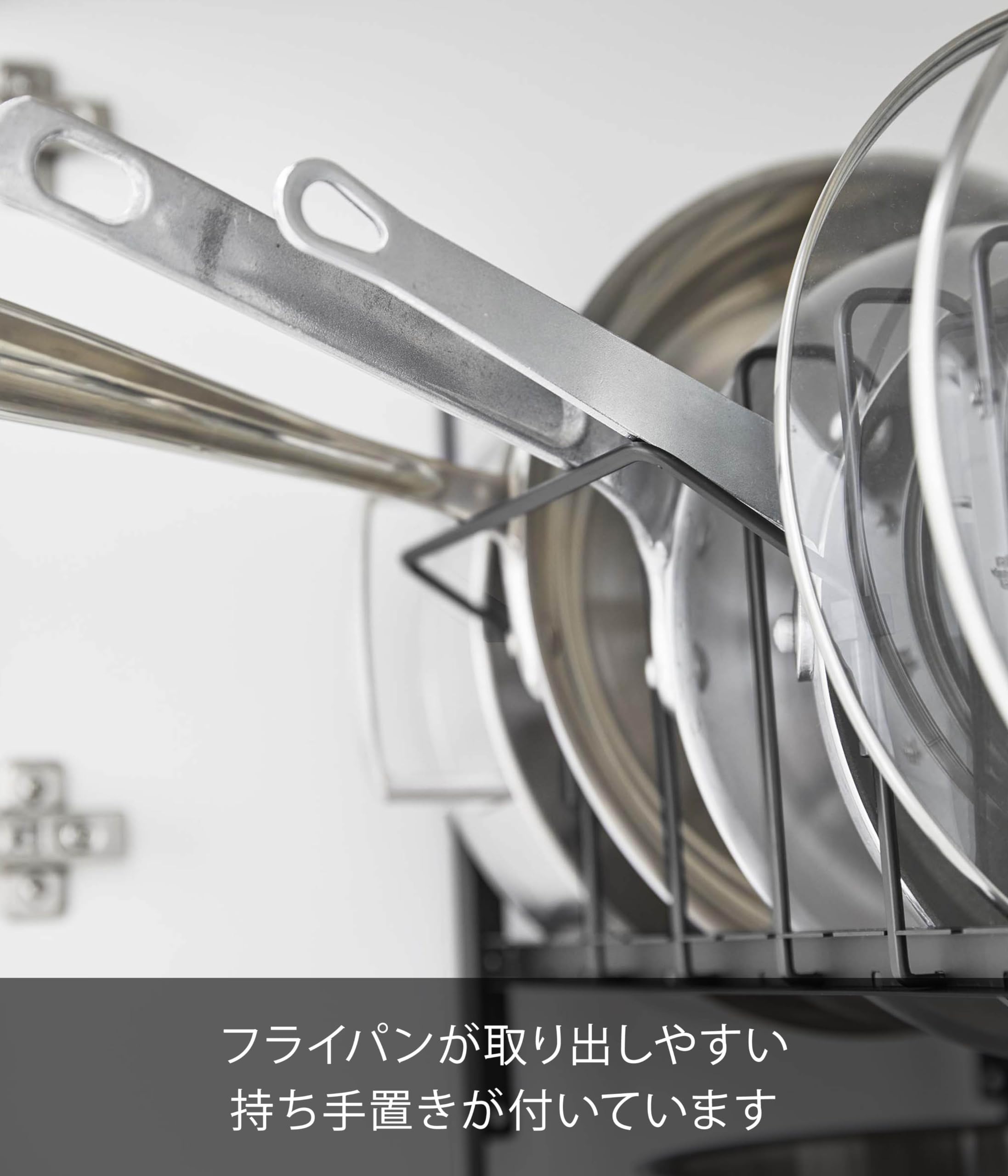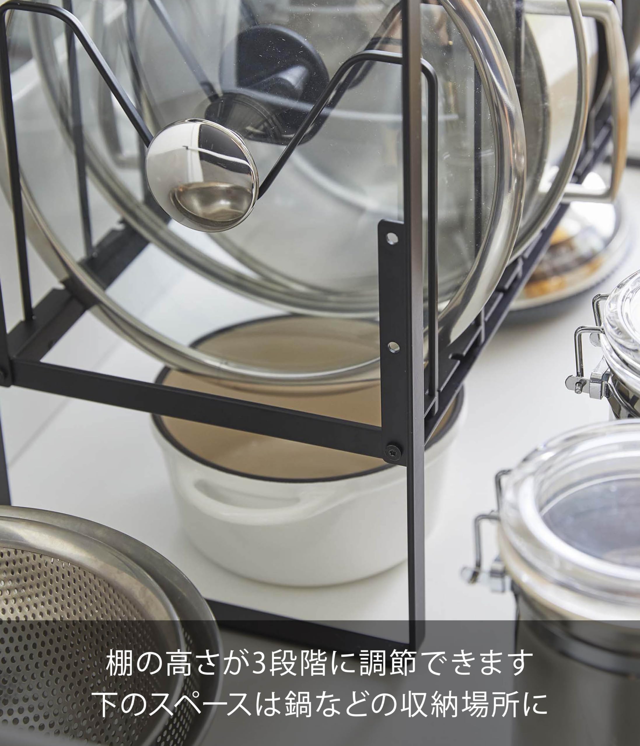 フライパンや鍋蓋を立てて収納でき、高さ調節できるから下のスペースも有効活用!