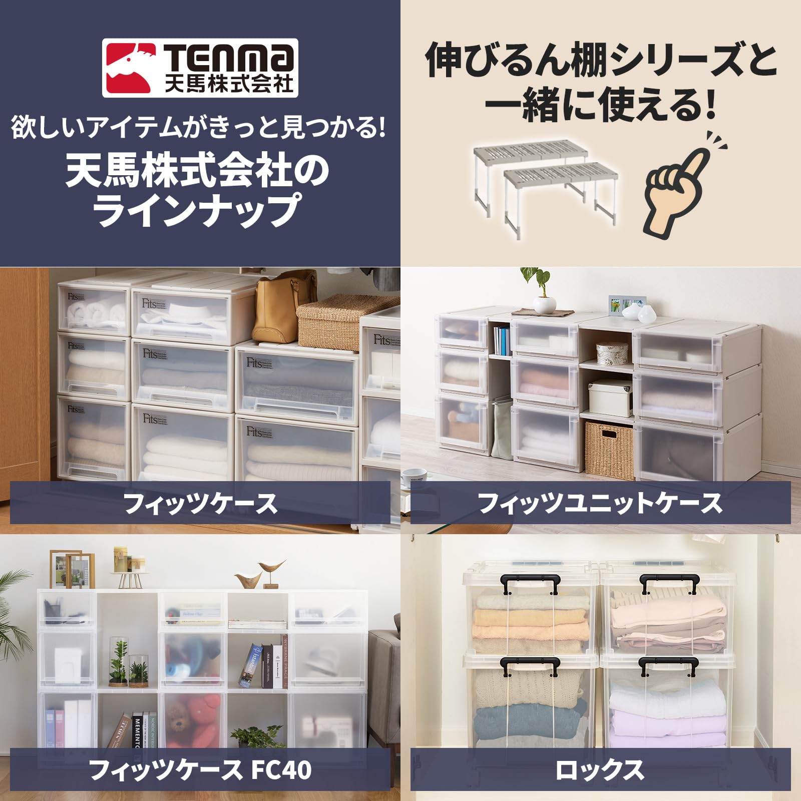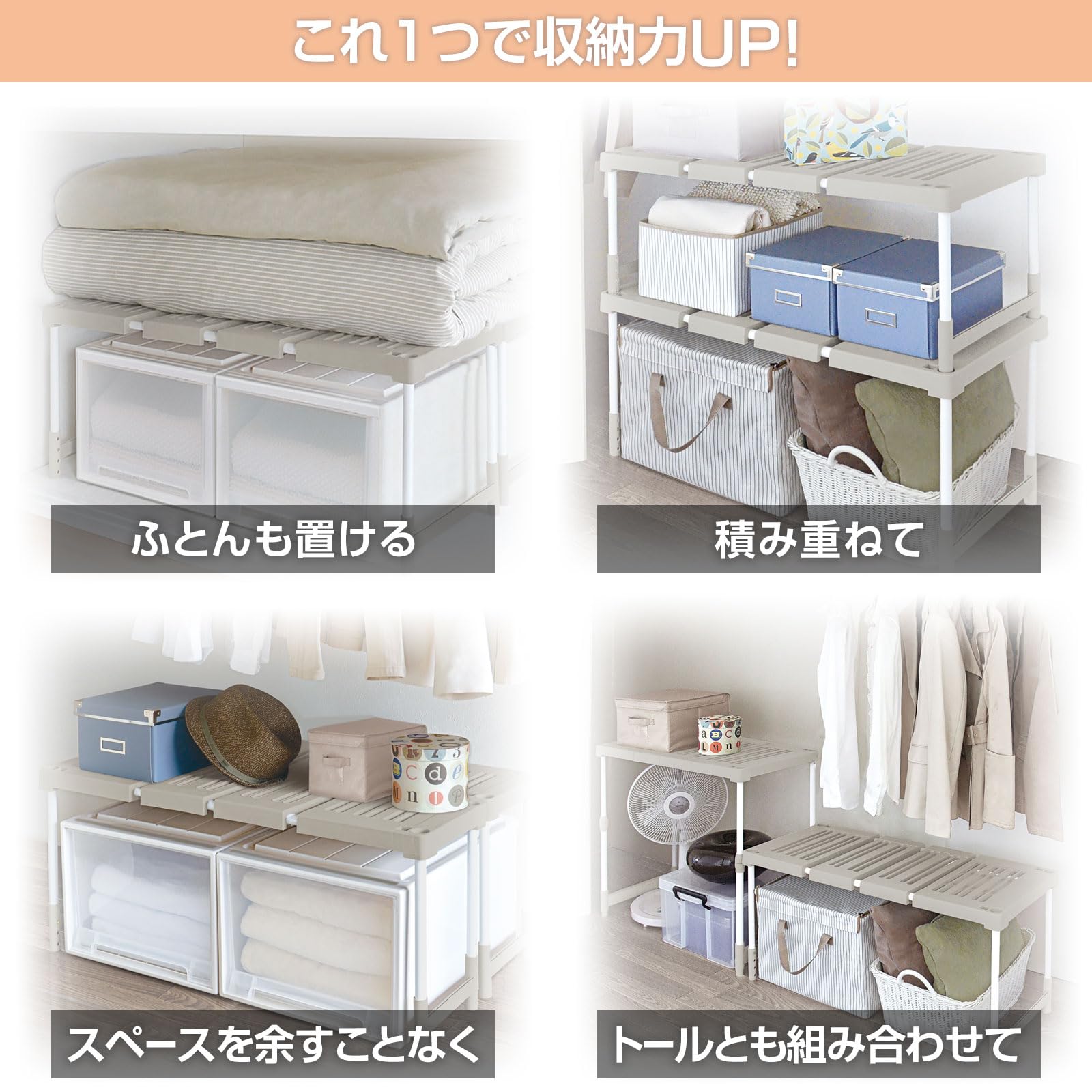 前後・左右に並べたり、上下に積み重ねて押入れやクローゼットの空きスペースを有効活用!