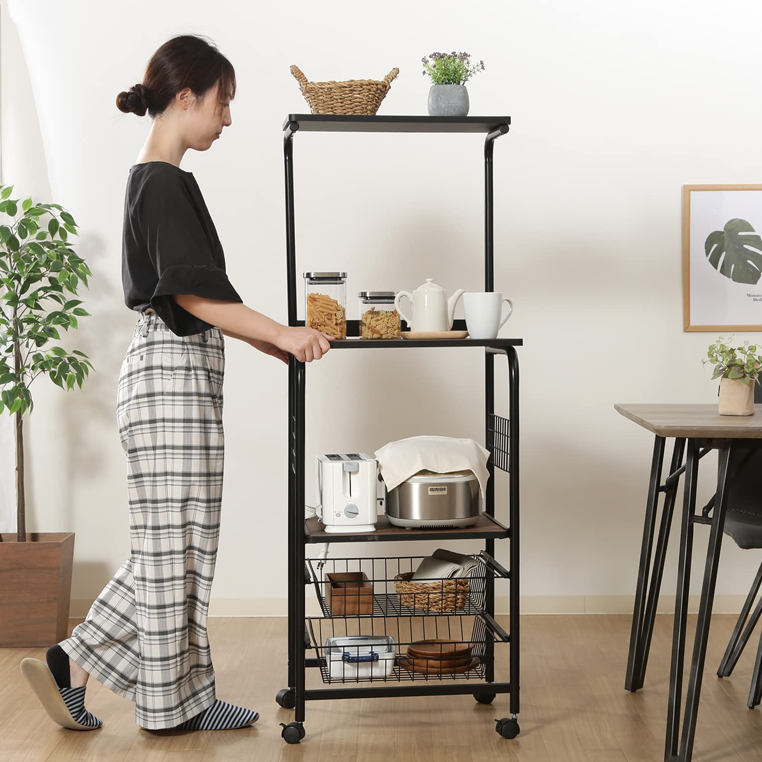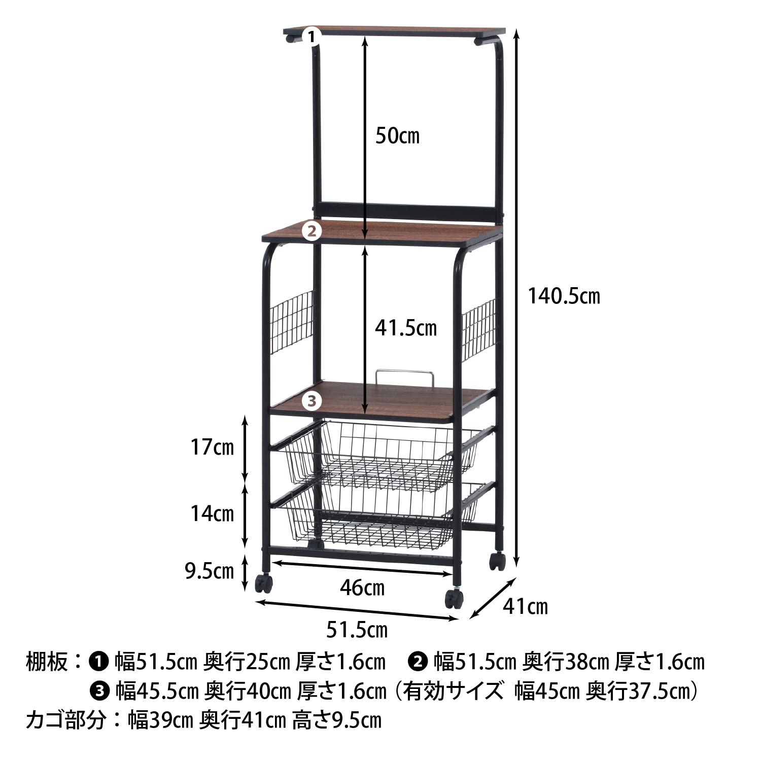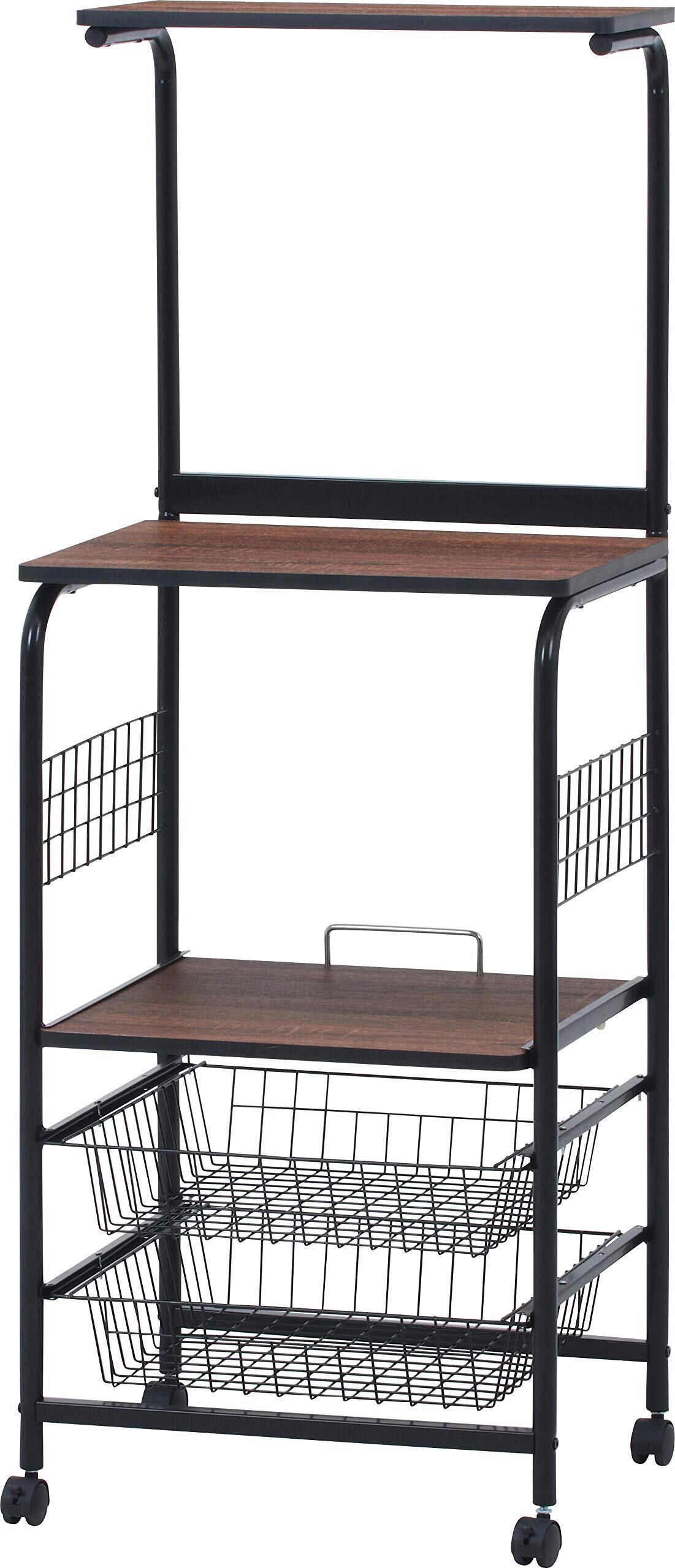 不二貿易 レンジ台 キッチンラック 幅51.5×奥行41×高さ140.5cm ブラック ブラウン スライド棚 収納 レンジワゴン キャスター付き 14637