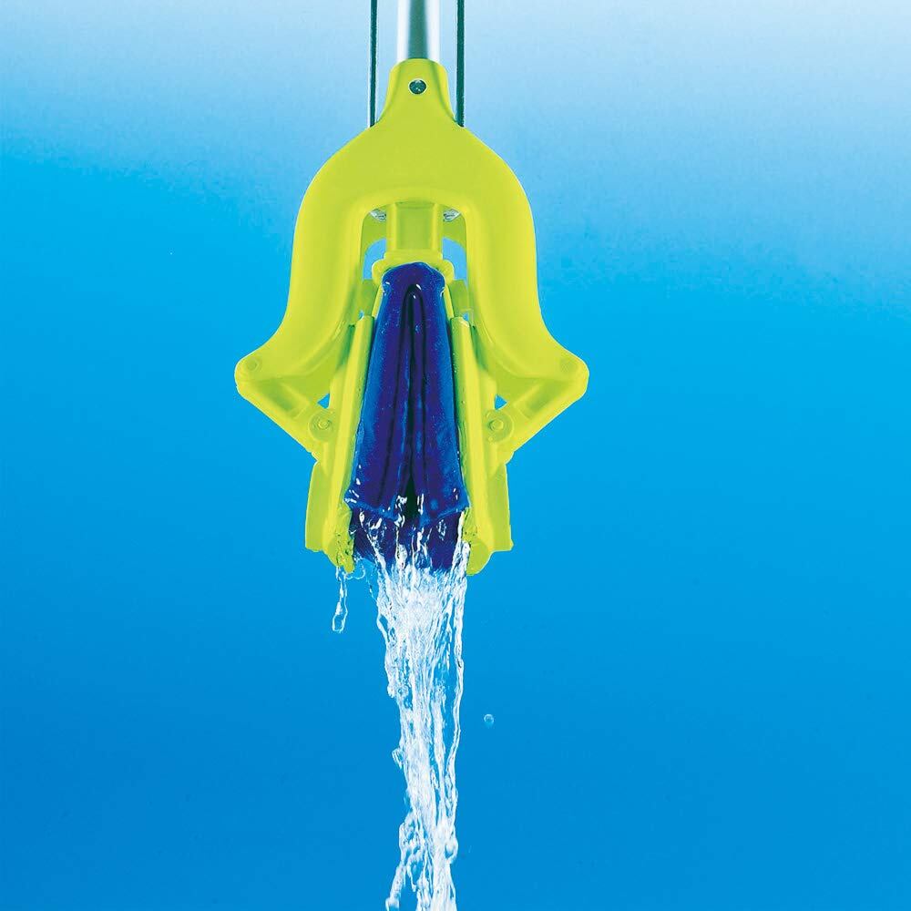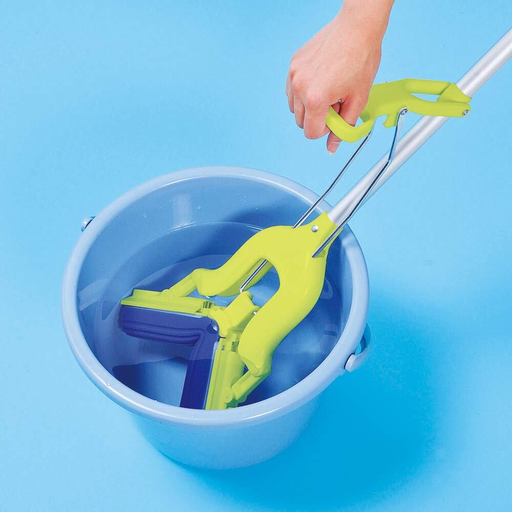 【レバーを引くだけでラクラク激絞り。】拭き取った水は、ラクラクレバーを引き上げるだけでスポンジのスミまで一気に絞れます。レバーを引けば通常の丸型バケツにヘッドが入るのでスポンジの洗浄も簡単です。