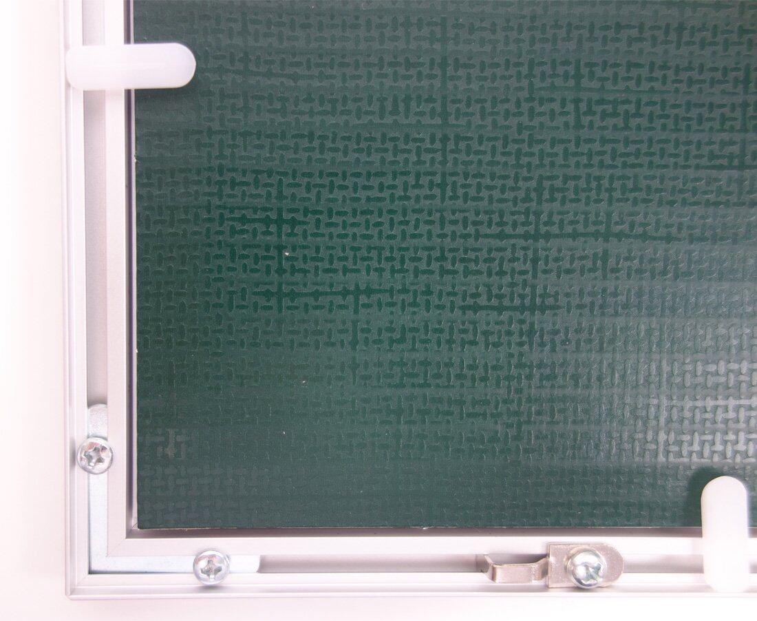 フレーム:アルミ、表装材:R-PETシート(厚み:約0.4㎜)、裏板:グリーンダンボール(古紙パルプ配合)
