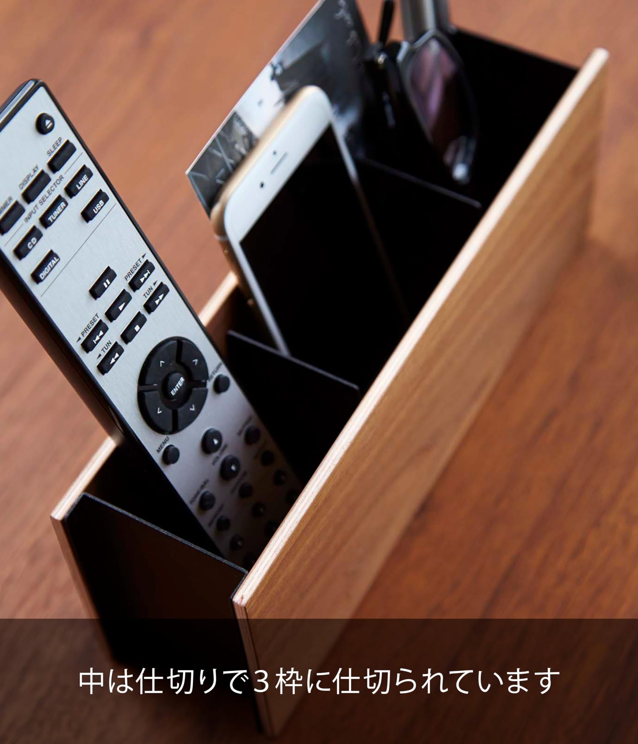 美しい木目でインテリア性のあるスタイリッシュで使い易いリモコンラック。仕切りの隙間にDMなども収納可能。