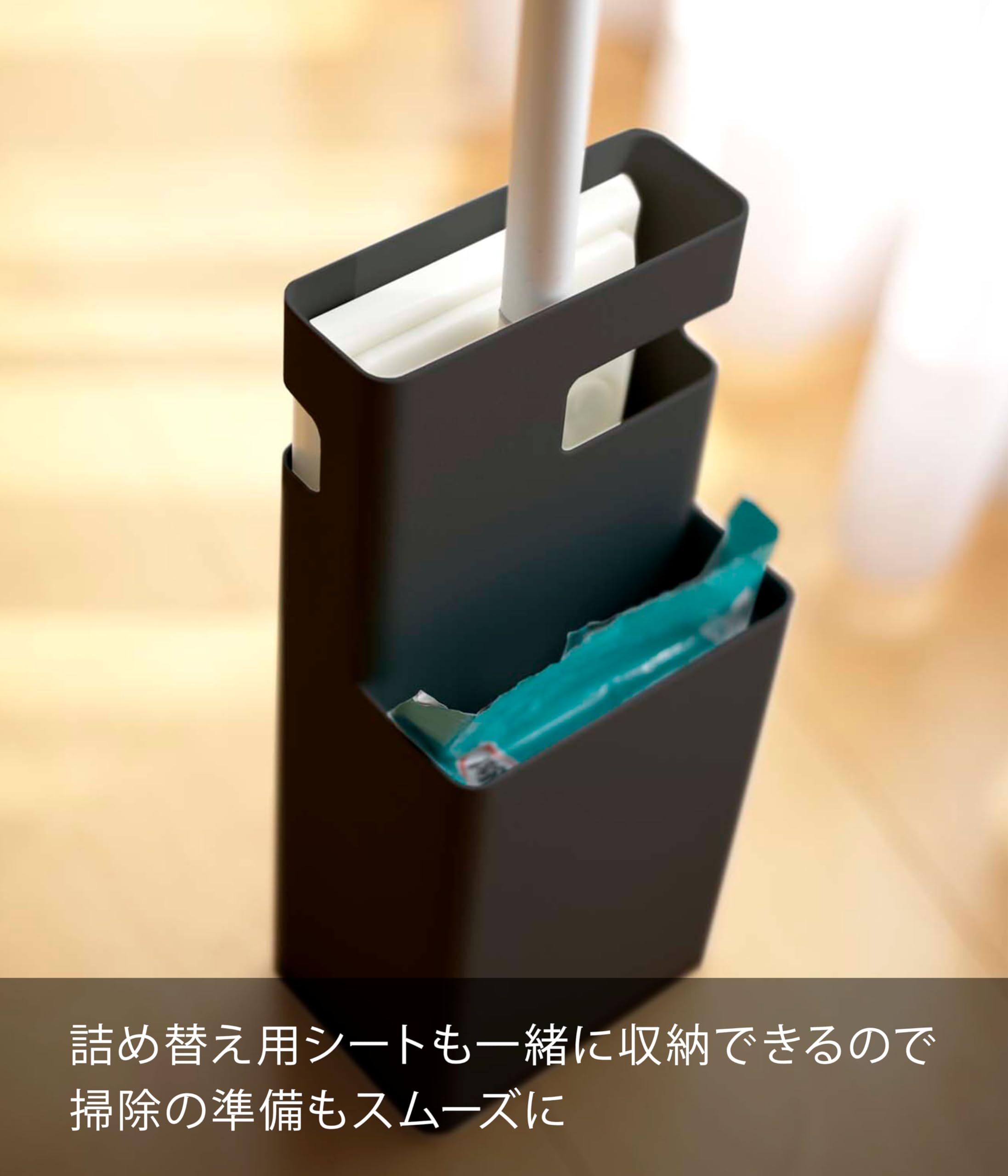 フローリングワイパーと取替えシートをすっきりまとめてコーナーに収納! 置き場所に困っていたフローリングワイパーや取替えシートが一緒にすっきり収納できます。持ち手となる穴が空いているので持ち運びもラクラク!