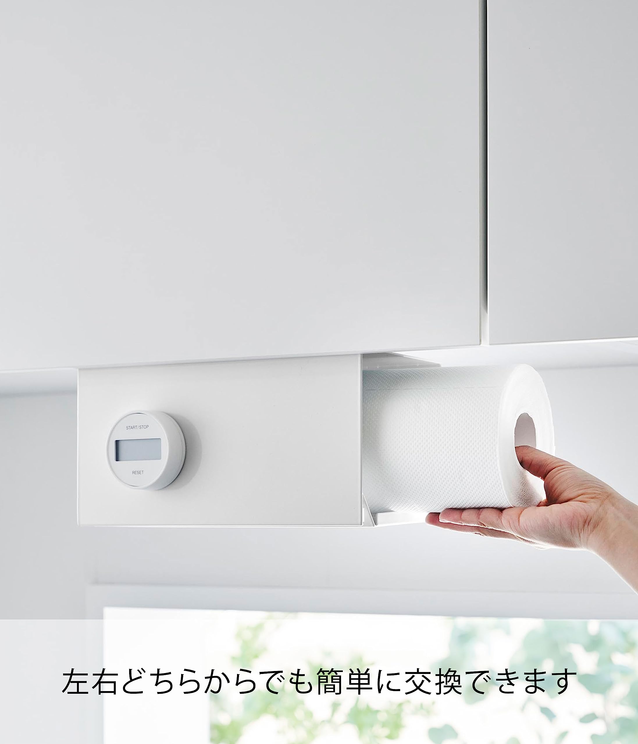 片手でカットできるカバー付きの戸棚下キッチンペーパーホルダー。