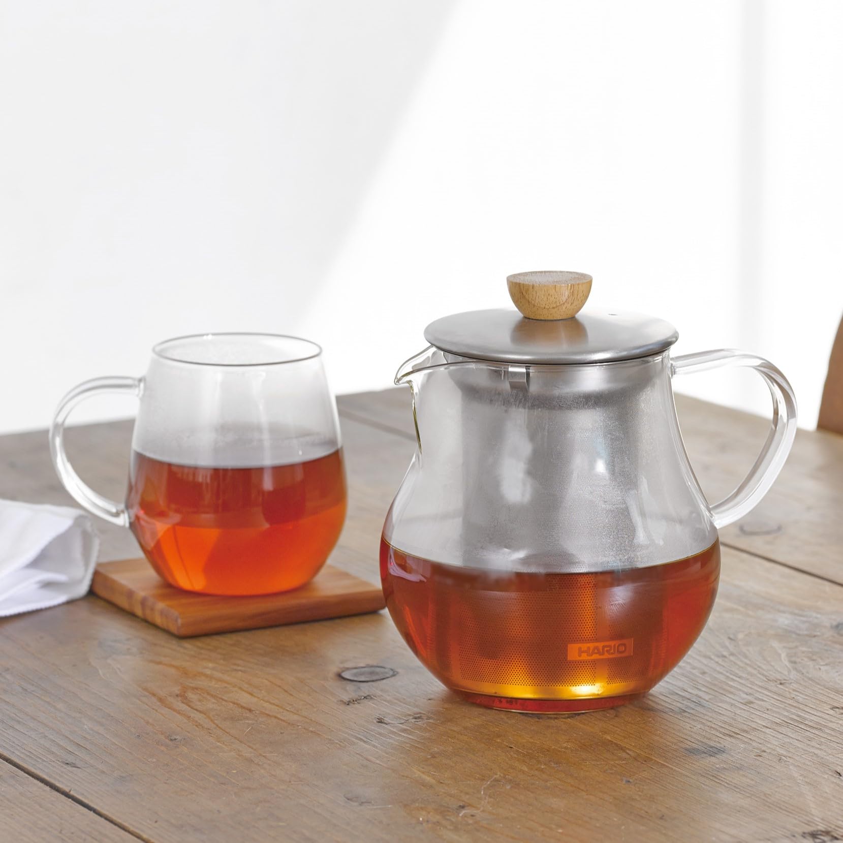 【商品詳細】本体サイズ:幅14.0×奥行10.5×高12.3cm、口径6.7cm、本体重量:245g、実用容量:450mL、本体材質:耐熱ガラス/日本製、フタ・ストレーナー:ステンレス/中国製
