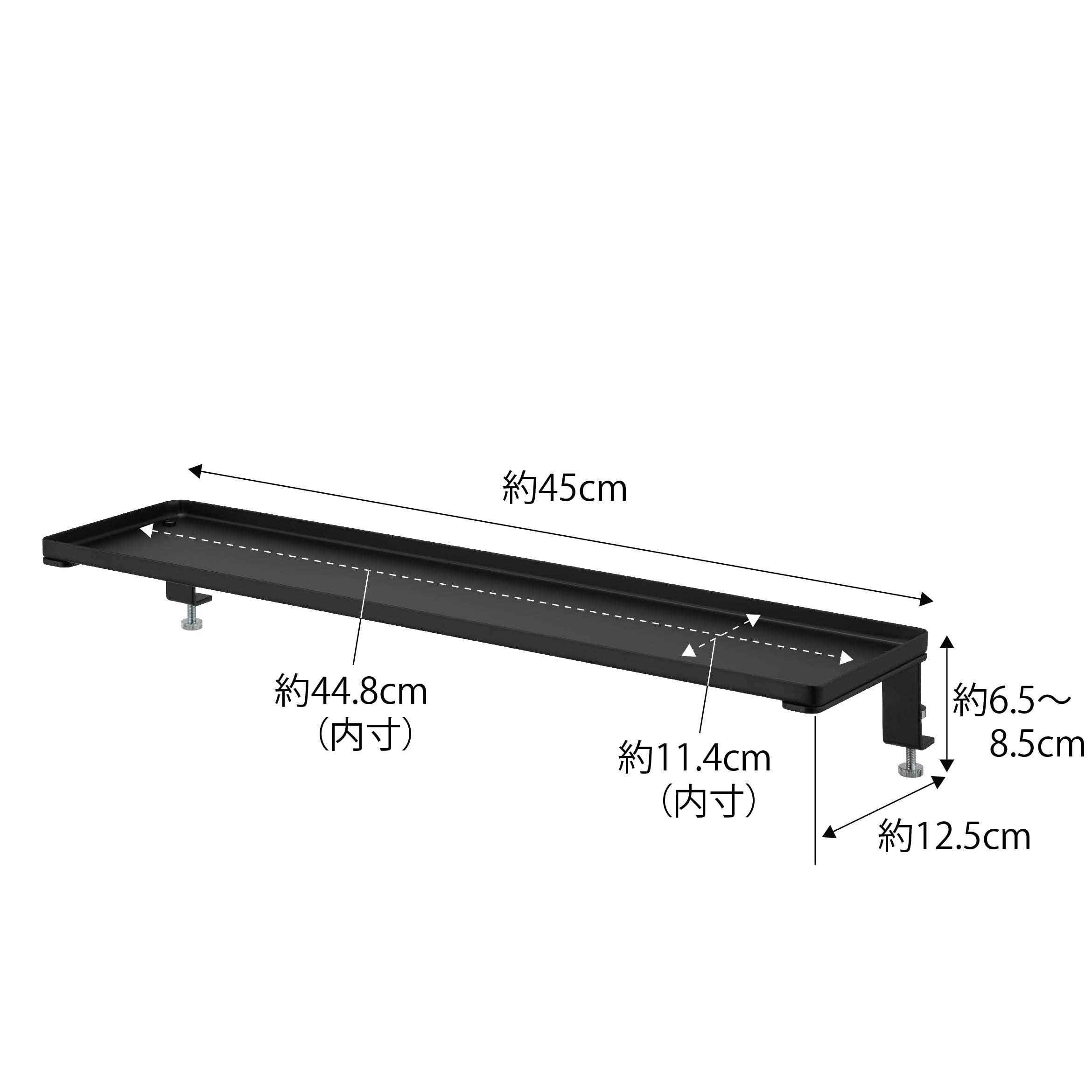 ■商品サイズ:約W45×D12.5×H6.5から8.5cm、■内寸サイズ:棚板/約W44.8×D11.4cm(縁/約H0.9cm)、■商品重量:約580g、■材質:本体/スチール(粉体塗装)、■付属品:六角レンチ、■耐荷重:約3kg、■取り付け可能な場所:木製の鴨居・スライド扉の枠・窓枠・机・棚,枠の幅/約45cm以上(本品の幅)・枠の厚さ/約2cmから3.5cm・枠上部の奥行き/約1cm以上・枠下部の奥行き/約1.5cm以上【注意】、※ピンで刺すため取り付け箇所に2mmほどのピンの穴が残ります。ピンの穴跡が残っても差支えのない所に取り付けてください。、※取り付け部の強度を必ずご確認の上取り付けてください。