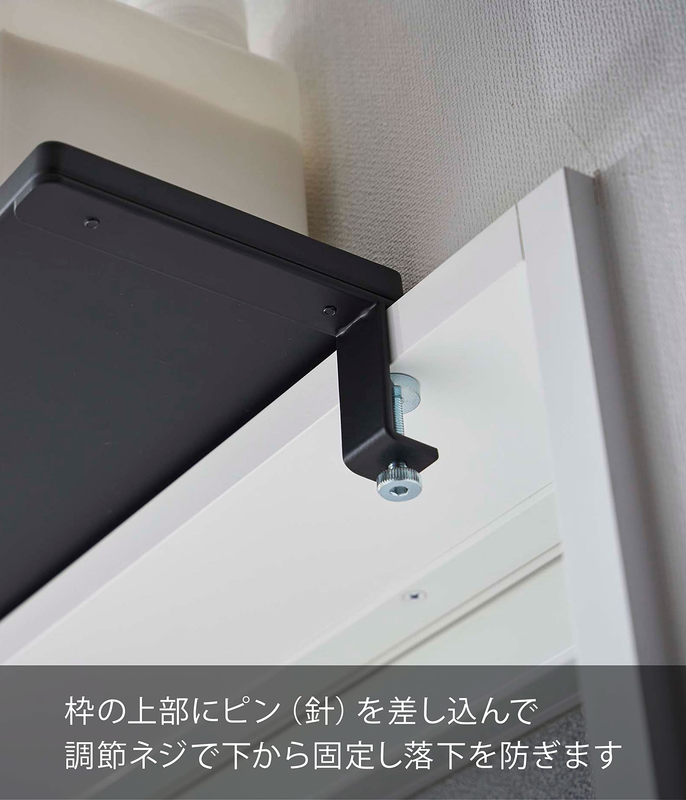 鴨居にはさんで調節ネジで固定するだけの簡単設置。