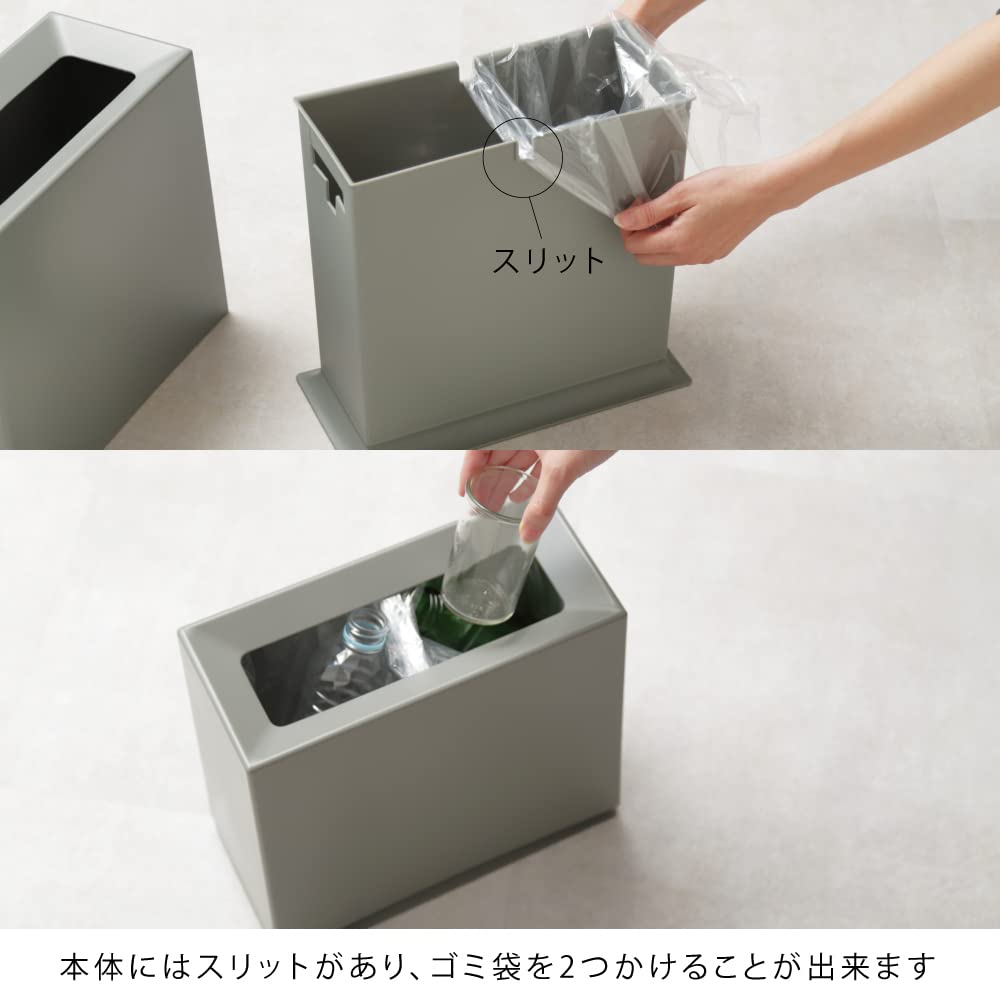 シンプルなデザインで機能的。スタイリッシュなゴミ箱です。中の袋が見えず、スリムで場所を取らない長方形のデザイン。デスク下やキッチンの狭いスペースに最適です。本体上部にスリットが入っているため分別も可能。コンビニ弁当のゴミもスッポリ収まります。