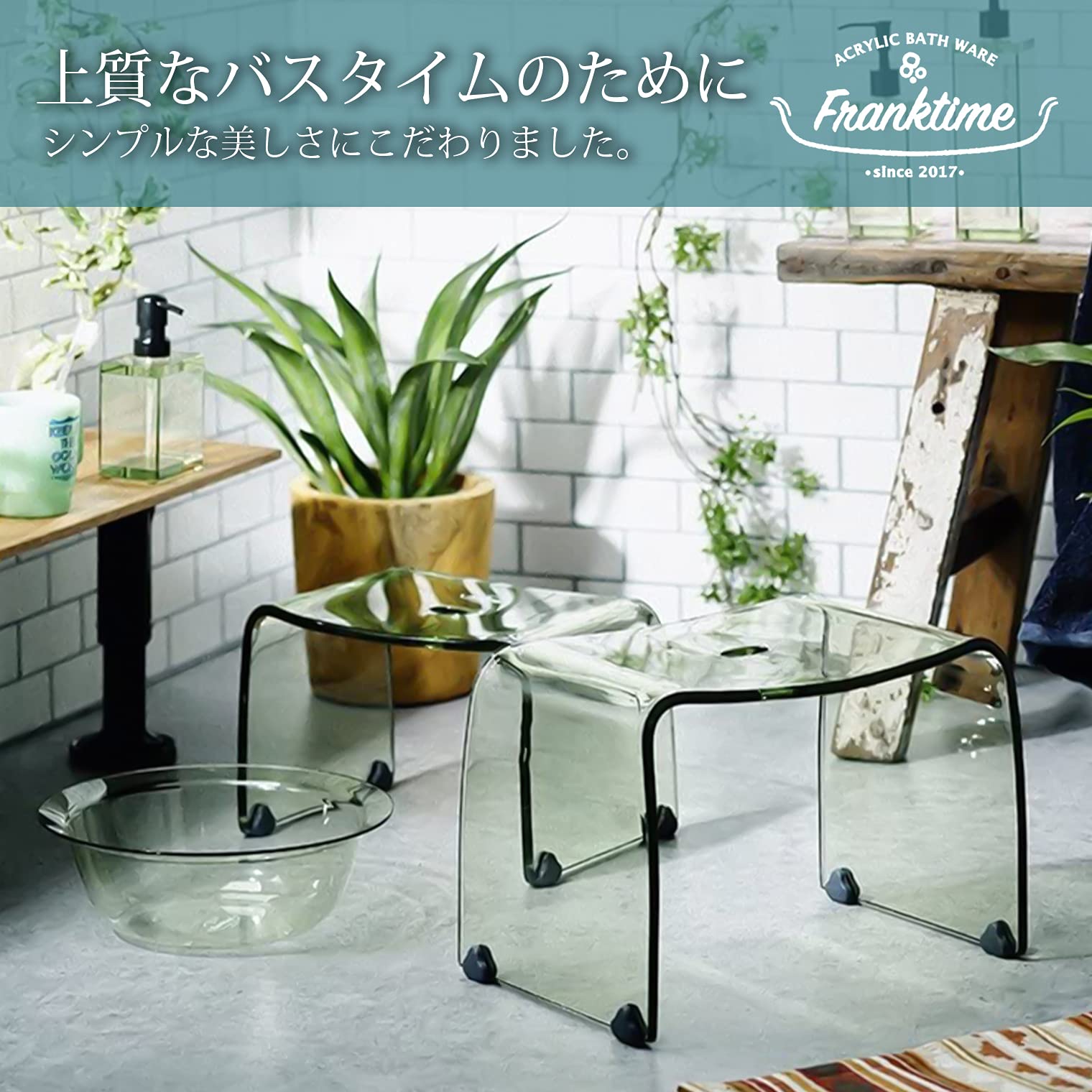 バスルームを広く開放的に見せてくれる、透明度の高いアクリル素材を使用したバスチェア