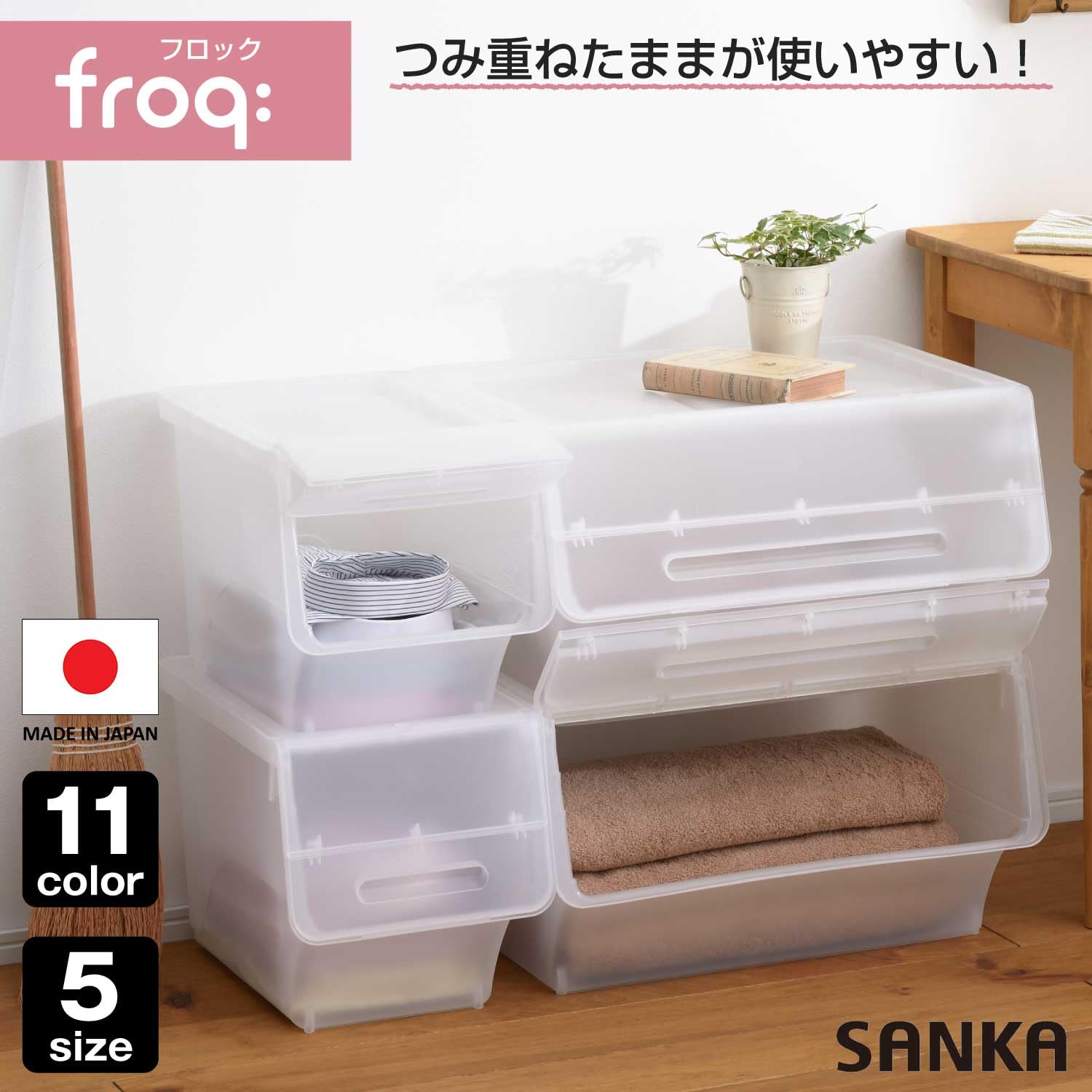 【大特価商品】サンカ フロック 重ねて使える蓋付き衣装ケース ワイド クリア おしゃれな大容量収納 引き出さずに使える前面開閉式 カパっとひらく固定できるフタ キャスター取り付け可能 日本製 衣類 収納ボックス (幅57×奥行46×高さ31cm) froq Nfr-W30CL