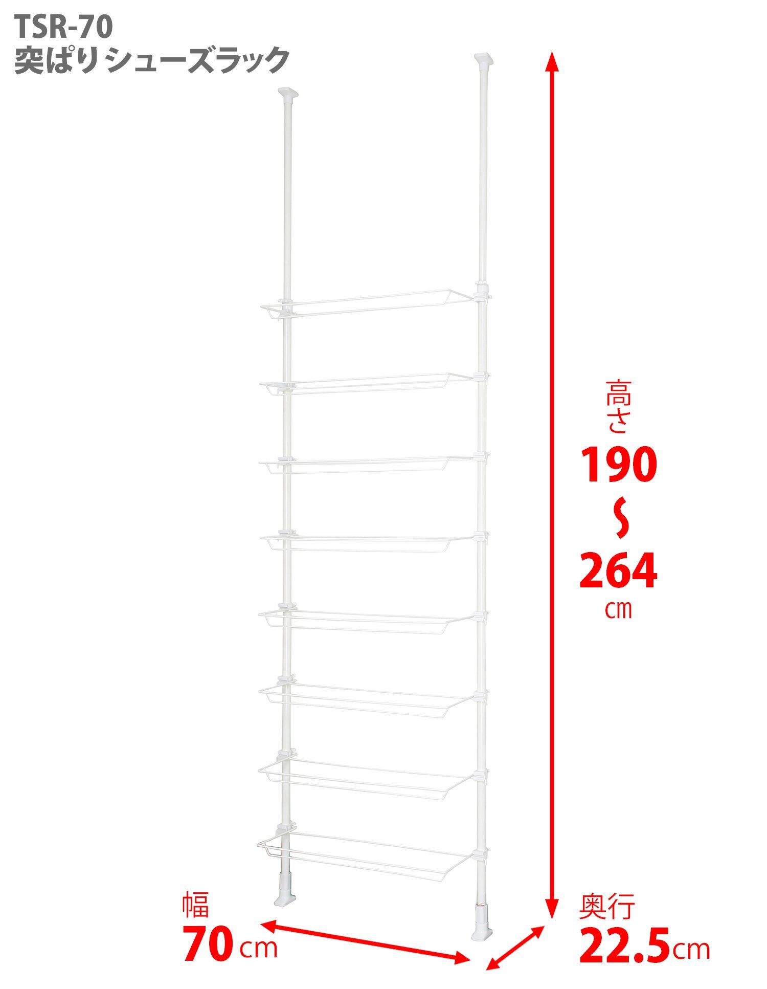 HEIAN SHINDO つっぱりシューズラック 24足対応 ワイヤー1本脚タイプ ホワイト 8段 取付幅70cm 取付高190~264cm TSR-70 平安伸銅工業
