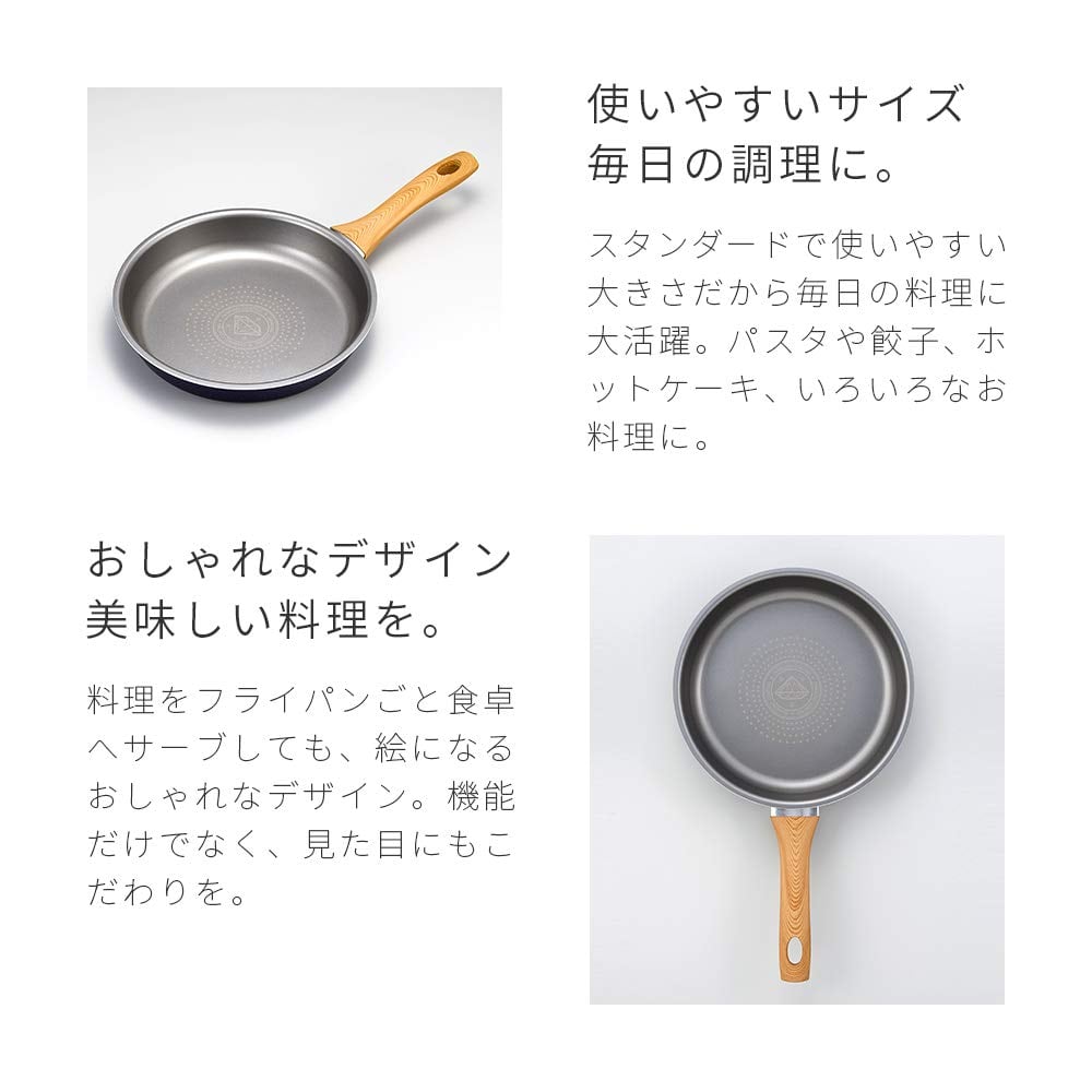 3.5mmの底厚で熱が均一に伝わりやすいIH対応フライパン。焦げ付きにくいからお手入れ楽々。手になじむ木目調のフィットグリップ。内面2層、外面2層の多層コート!内面は人工ダイヤモンド配合のふっ素樹脂コートで耐磨耗性が高く、外面はセラミックコートで汚れが落としやすい!