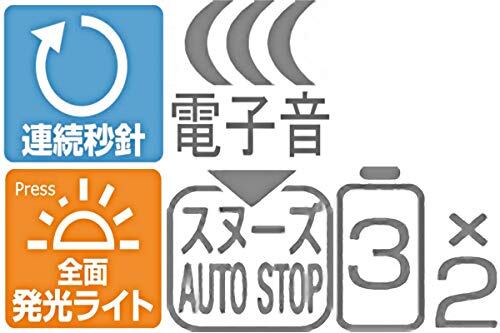 文字板が全面発光する照明ライト。動きの滑らかな連続秒針。アラームは4段階トーンの電子音。(止めても又鳴るスヌーズ機能)