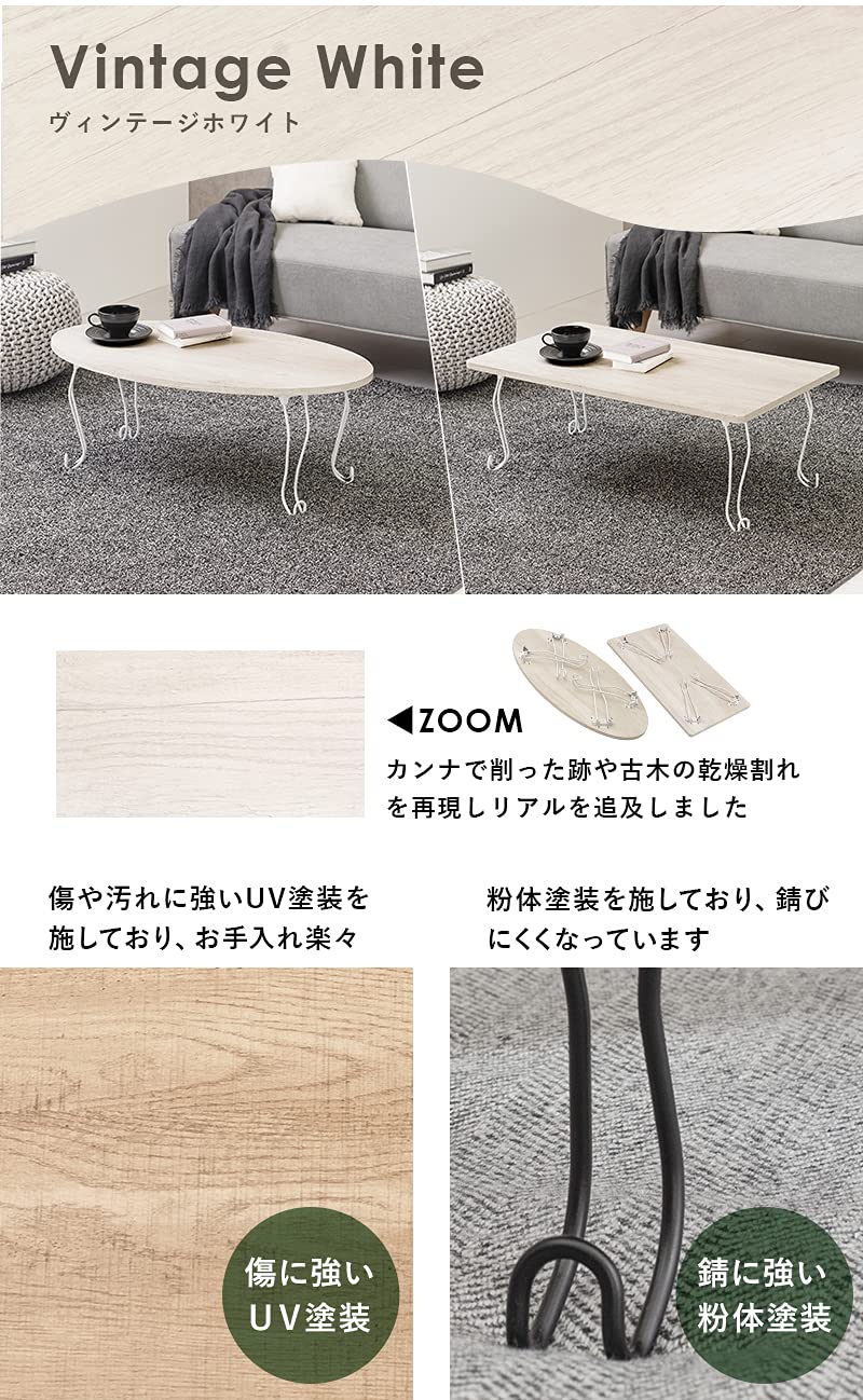 【限定大特価】萩原 ローテーブル センターテーブル テーブル 机 【木目調天板×猫脚スチール脚】 折りたたみ 完成品 軽量 可愛い リビング ソファテーブル 幅90 楕円 ホワイト MT-6865WS | ももくま屋さん